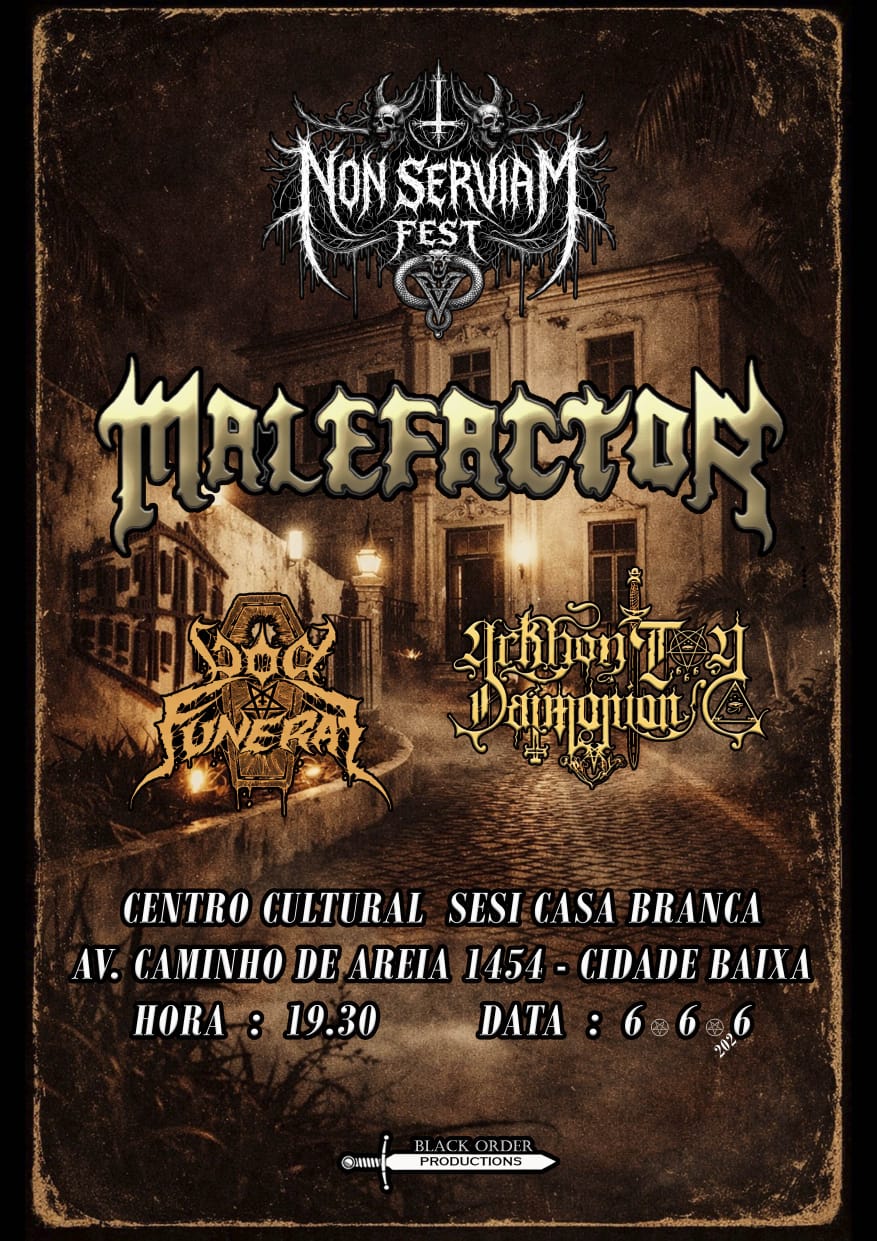 A faixa é a primeira amostra do aguardado debut álbum homônimo e sintetiza a essência arcana e ritualística que o grupo evoca desde os anos 90. Sob a organização da Black Order Productions, a noite promete ser um marco para o underground baiano, unindo o Unholy Metal do Malefactor à brutalidade Old School do God Funeral em uma celebração de resistência e obscuridade. Confira abaixo o cartaz e serviço completo para mais informações: