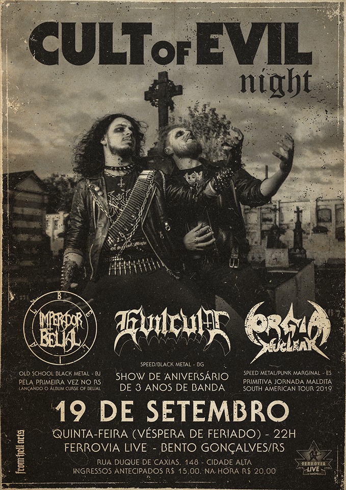 Nesta data, a banda estará lançando oficialmente seu atual trabalho “Curse Of Belial”, no festival “Cult Of Evil Night”, onde dividirá palco com os gaúchos do Evil Cult e os capixabas do Orgia Nuclear. O evento acontecerá no já conhecido Ferrovia Live, com ingressos custando apenas R$ 15,00 (antecipado) ou R$ 20,00 (na hora), confira o cartaz:
