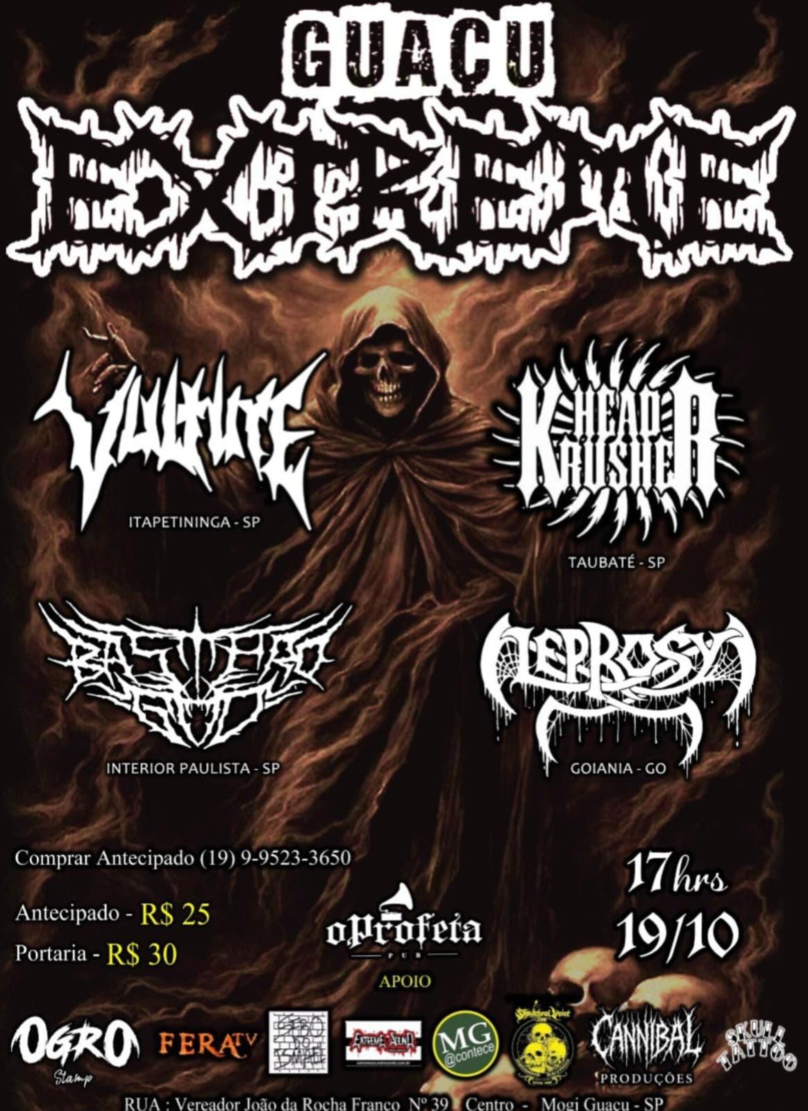 No domingo, 19 de outubro, o LEPROSY segue para Mogi Guaçu, onde será uma das atrações principais do ‘Guaçu Metal Fest’. O evento será realizado no O Profeta Pub (@profetapub) a partir das 17h e também contará com os shows dos grupos Vulture, Head Krusher e Bastard God. Confira abaixo o cartaz e serviço completo para mais informações:
