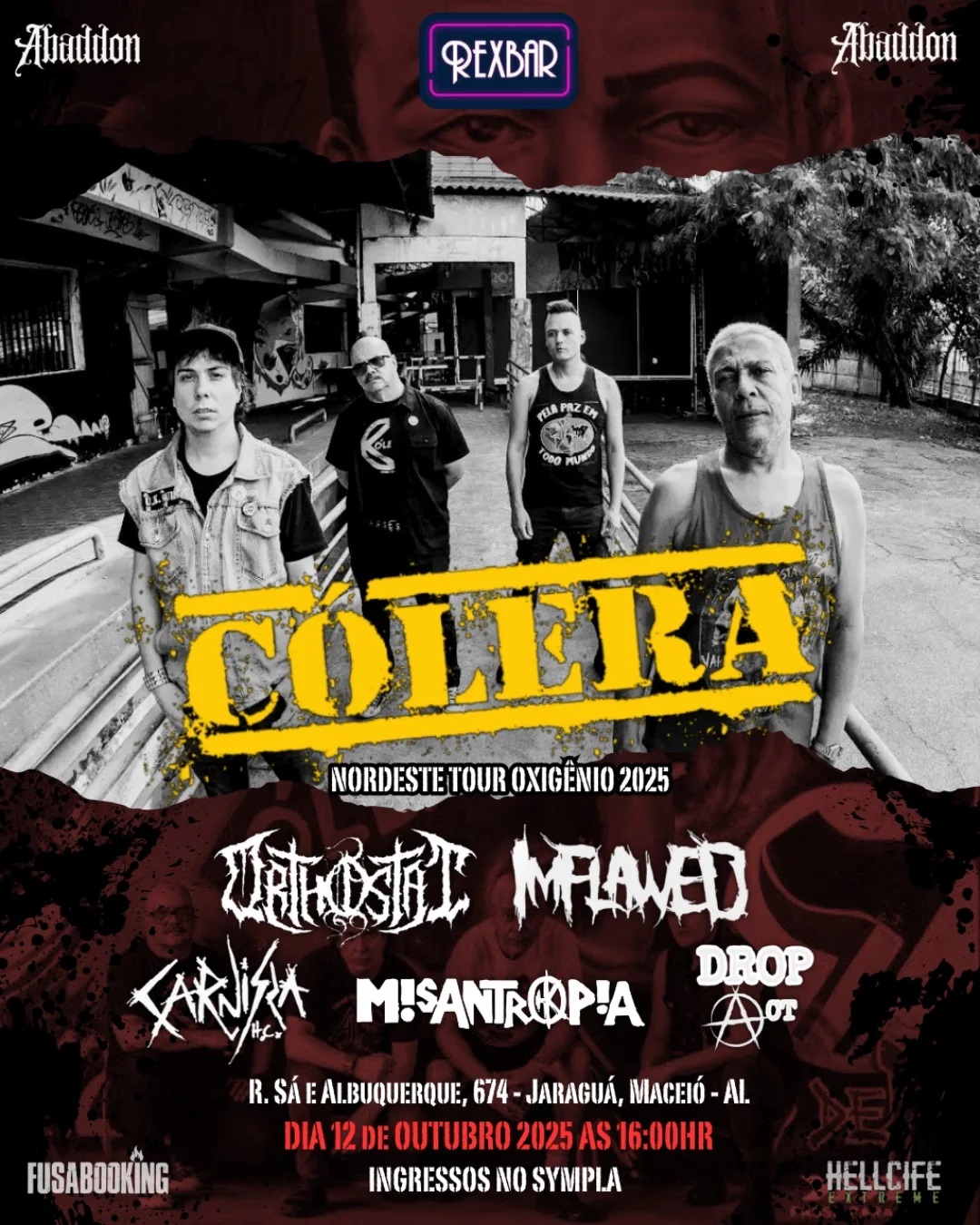 Finalizando a primeira parte da turnê, no domingo, 12 de outubro, o grupo toca em Maceió/AL, no Rex Bar (@rexjazzbar), em um evento que também contará com os pioneiros do Punk nacional, o Cólera, além de Imflawed, Carnissa, Drop Act e Misantropia. Confira abaixo o cartaz e o serviço completo para mais informações: