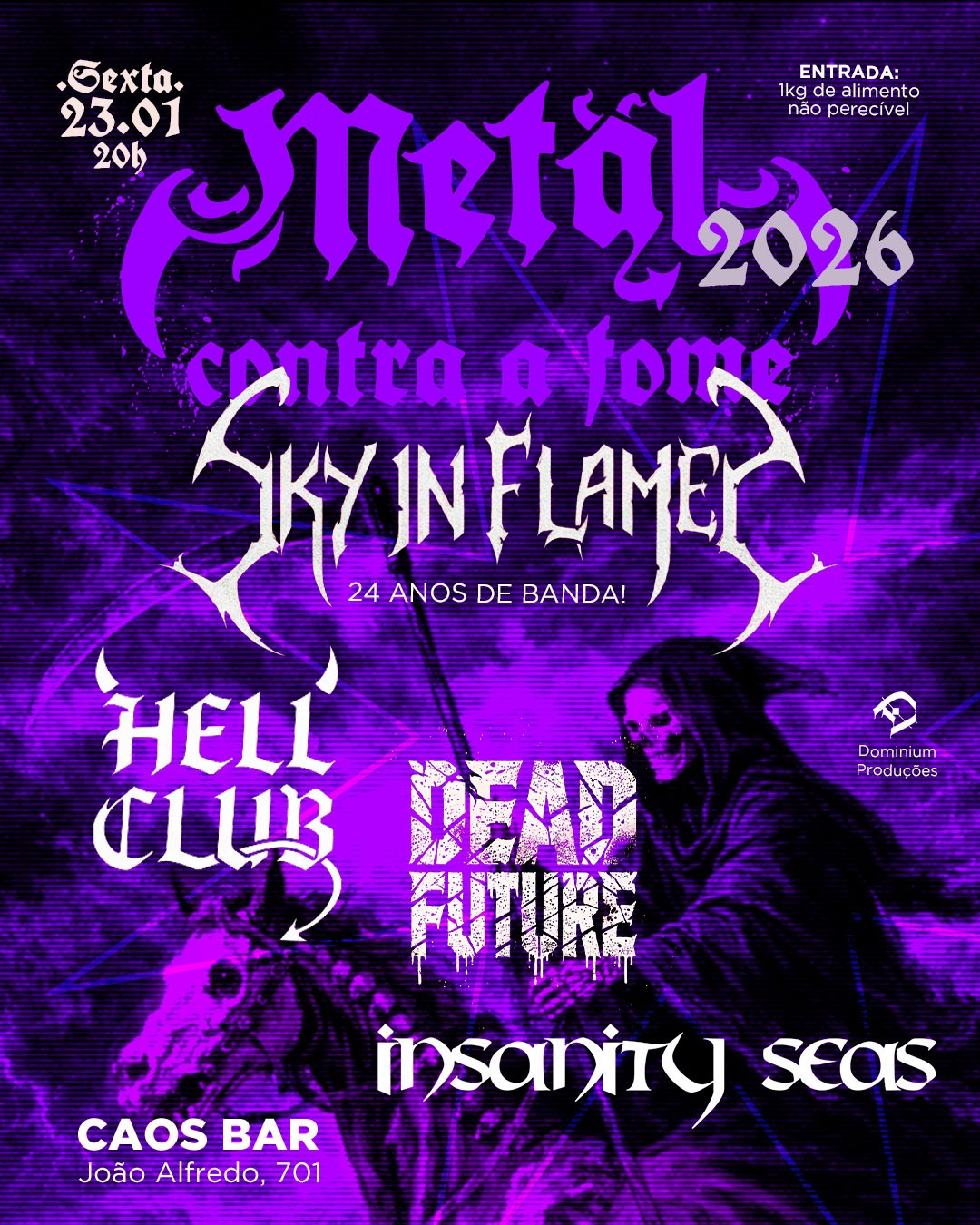 A capital gaúcha se prepara para uma noite onde o Death Metal e a consciência social caminham lado a lado. O SKY IN FLAMES, um dos nomes mais resilientes do Metal extremo do Rio Grande do Sul, celebra 24 anos de estrada nesta sexta-feira, dia 23 de janeiro. O evento ocorre no Caos Bar (@caospoa), em Porto Alegre, como atração principal do projeto ‘Metal Contra Fome’, que visa arrecadar alimentos para a Cozinha Solidária do MTST. A noite contará ainda com a destruição sonora das bandas Insanity Seas, Hellclub e Dead Future.