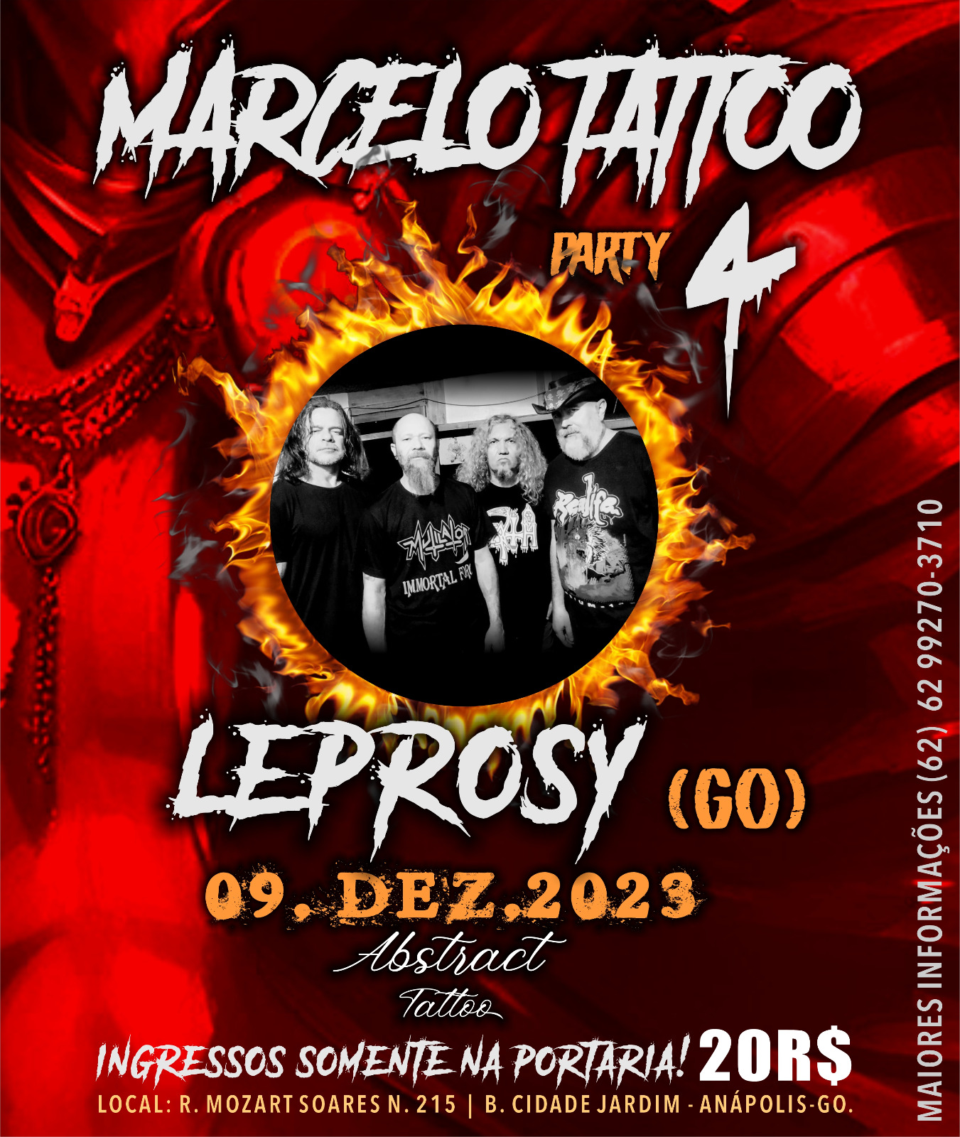 E para celebrar em grande estilo este acontecimento, o LEPROSY anunciou que estará promovendo a distribuição deste single ao vivo a quarta edição do ‘Marcelo Tattoo Party’, que acontece no mesmo dia do lançamento na cidade de Anapolis/GO e contará também com Fim do Mundo, 8K, Krakkenspit, Prostibulus e os brasilienses do Os Cabelo Duro. Confira abaixo o cartaz e serviço completo para mais informações: