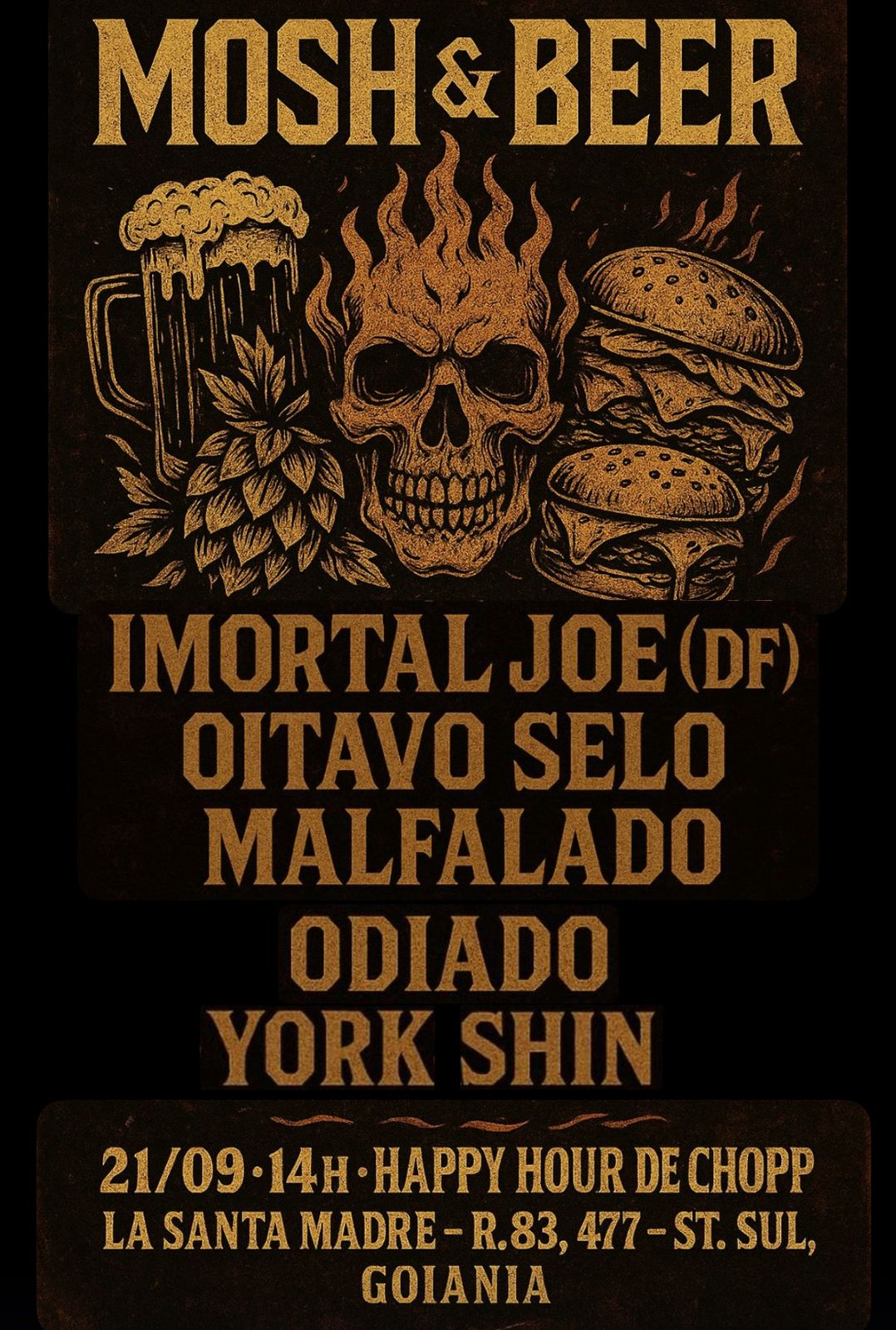 O festival ‘Mosh & Beer’ contará também com as bandas Imortal Joe, Oitavo Selo, Malfalado e York Skin, prometendo uma tarde de peso e intensidade para o público local. Os ingressos antecipados estão disponíveis por R$ 15,00 e os participantes que os adquirirem concorrerão a uma tatuagem no valor de R$ 350,00. O início do evento está programado para as 16 horas. Confira abaixo o cartaz e o serviço completo para mais informações: