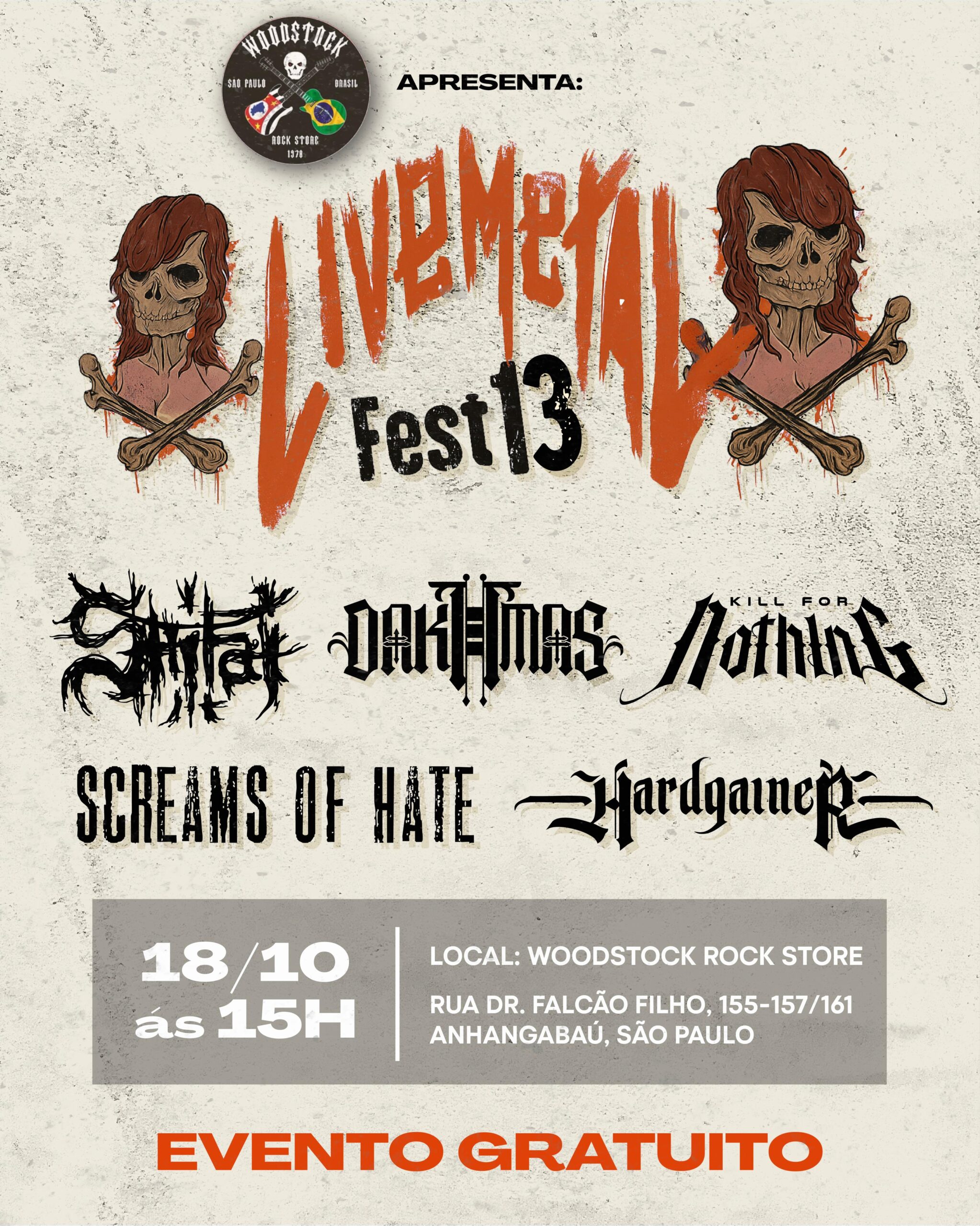 Após o lançamento de seu EP de estreia, “Shitai”, e do recente single “Agressão Brutal”, a banda de Death/Crossover SHITAI anuncia sua participação no ‘Live Metal Fest 13’. O evento, que promete agitar a lendária Woodstock Rock Store em São Paulo/SP no sábado, 18 de outubro de 2025, a partir das 15 horas, contará também com as bandas Screams of Hate, Dakhmas, Kill For Nothing e Hardgainer, consolidando a agenda de divulgação ao vivo do grupo na capital paulista. Confira abaixo o cartaz e o serviço completo para mais informações: