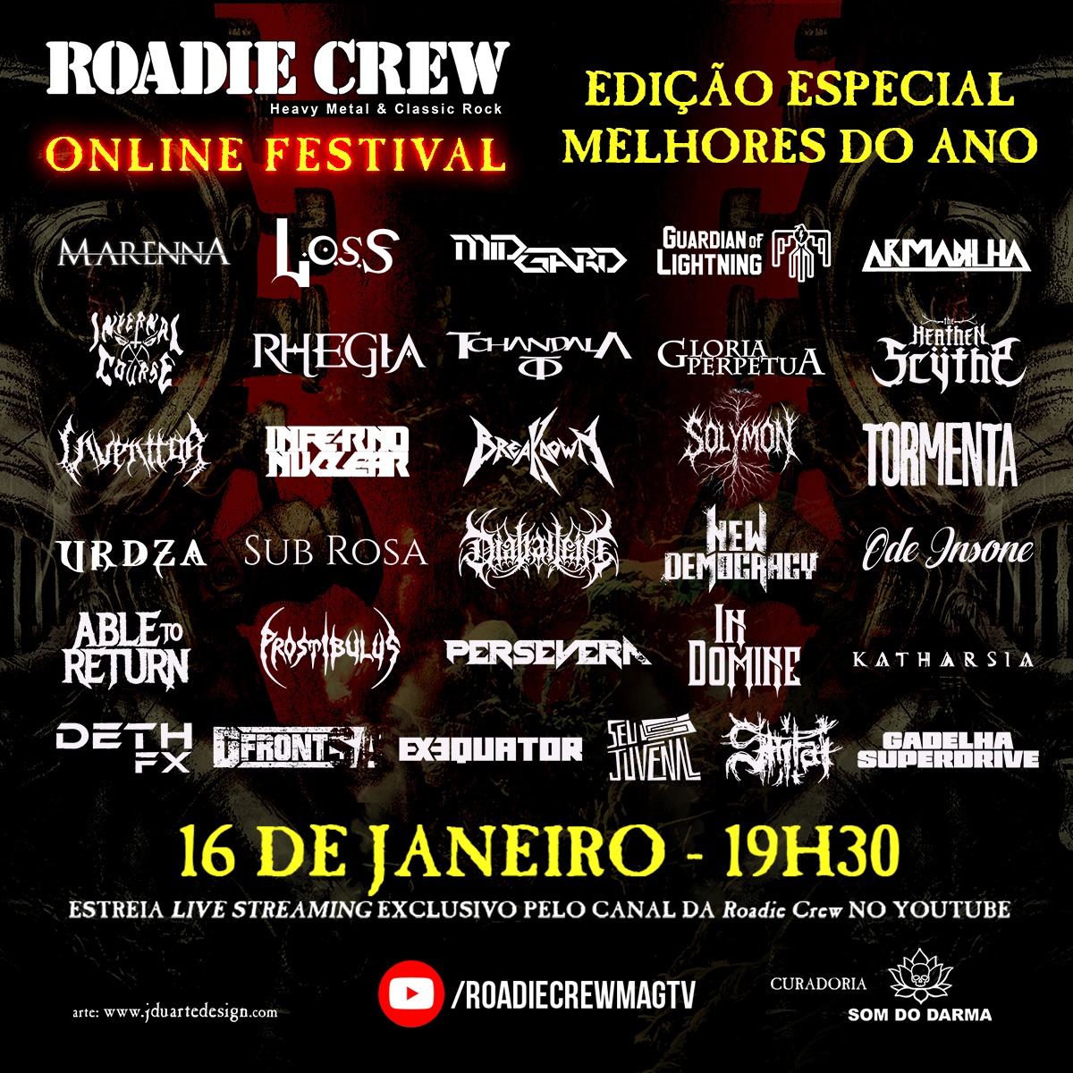 O evento, que ocorre nesta sexta-feira, 16 de janeiro de 2026, contará com a exibição do videoclipe da faixa “Eternal Vortex” o DIABÁLLEIN divide o line-up com outros nomes de peso da cena extrema e convencional, como Shitai, Prostibulus, Inferno Nuclear e Inventtor. A transmissão terá início às 19h30, exclusivamente pelo canal oficial da revista Roadie Crew no YouTube. Confira abaixo o cartaz e o serviço completo para mais informações: