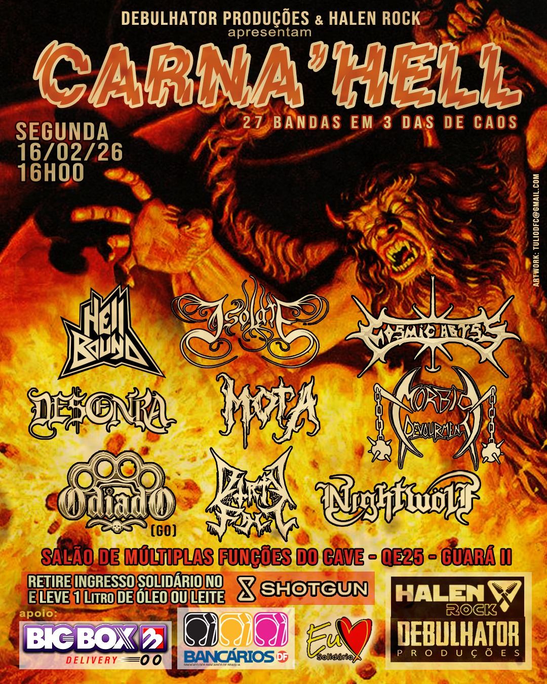 O quarteto goiano ODIADO acaba de confirmar sua participação em um dos eventos mais intensos do calendário brasiliense: o festival ‘Carna’ Hell’. O grupo sobe ao palco no dia 16 de fevereiro de 2026 (segunda-feira), no Salão de Múltiplas Funções do CAVE, no Guará II. A apresentação faz parte da programação que reúne 26 bandas em três dias de celebração ao caos e à música extrema.