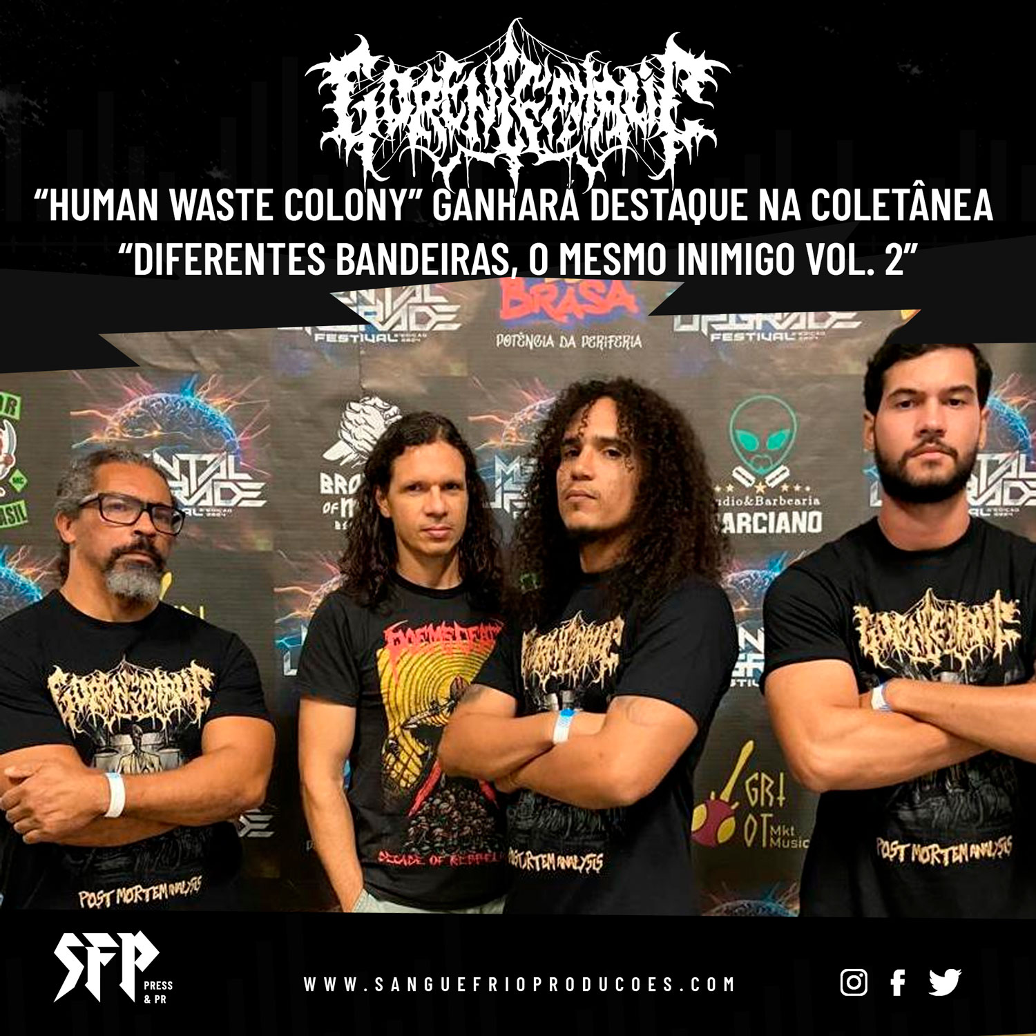Para esta união global, a banda selecionou a faixa “Human Waste Colony”, um dos principais destaques de seu atual EP, “Gore Of The Forgotten”. A escolha reafirma a identidade visceral do grupo, que divide o line-up com outros nomes de relevo da cena nacional, como Morthur (RS), The Cross (BA), Malkuth (PE), Orthostat (SC), Profane Art (RJ), além dos norte-americanos do Vindicator e Precious Blood, Cruenta Venganza diretamente da Alemanha, os franceses do Arbre-dieu e HighWay e muito mais.