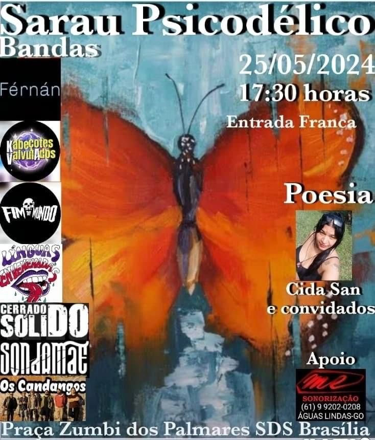 Em outras notícias, o FIM DO MUNDO já tem data marcada para subir aos palcos novamente neste mês de maio. A banda estará ao lado de Línguas Envenenadas, The Same Band, Cerrado Sólido, Os Candangos, Kabeçotes Valvulados, Som da Mãe, a cantora Lya e a poetisa Cida San no ‘Sarau Psicodélico’, que acontece no próximo dia 25/05 na Praça Zumbi dos Palmares em Brasília/DF. Confira abaixo o cartaz e serviço completo para mais informações: