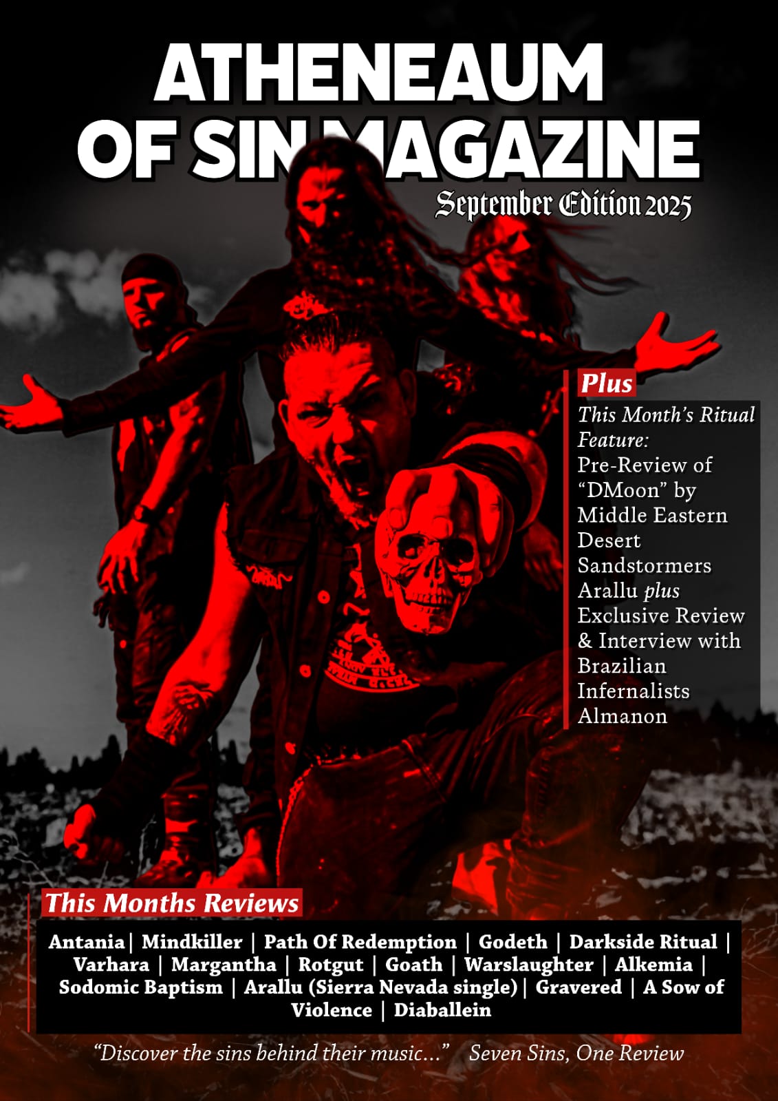 Com o recente lançamento do seu álbum, "Primitive Infernal", o grupo sul-mato-grossense de Black/Death Metal ALMANON segue ganhando notoriedade na imprensa nacional e internacional. A banda ganhou, nada menos, que seis páginas na edição de setembro de 2025 da revista digital britânica Atheneaum Of Sin Magazine.
