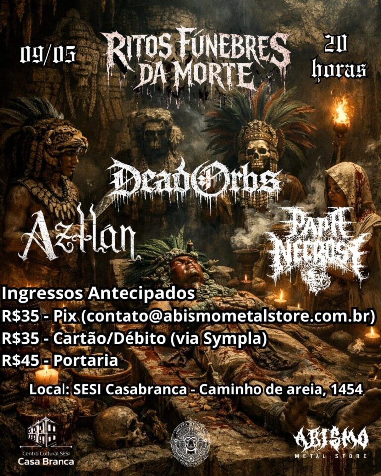 Garanta seu lugar no ritual: Os ingressos antecipados custam R$ 35,00 via Pix (contato@abismometalstore.com.br) ou pela plataforma Sympla. Na portaria, o valor será de R$ 45,00. Para compras via Pix, é obrigatório o envio do comprovante com nome completo para o WhatsApp (71) 99355-3989. Confira abaixo o cartaz e o serviço completo para mais informações: