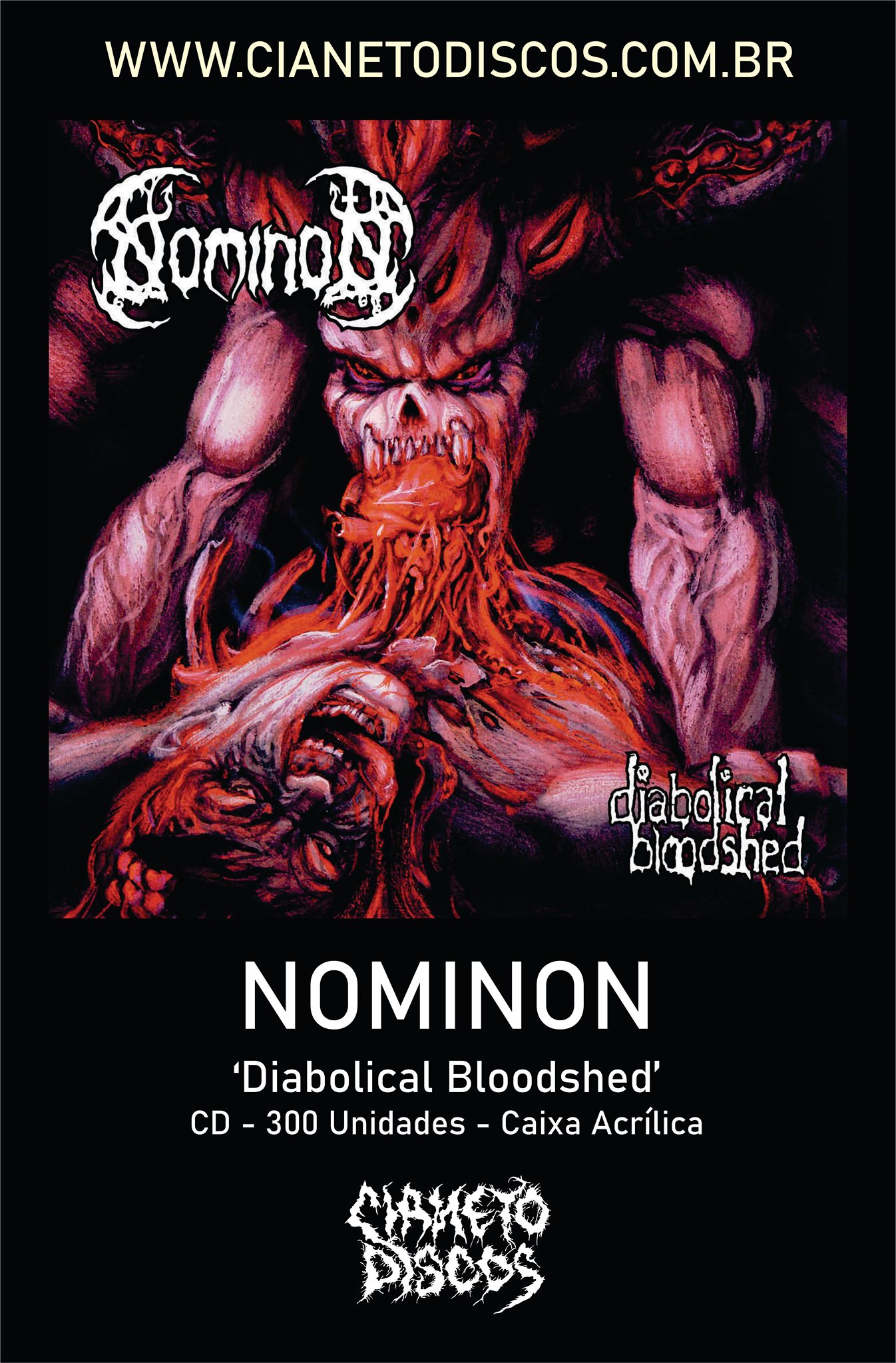 Em paralelo, a CIANETO DISCOS já disponibilizou o álbum “Diabolical Bloodshed” (1999), dos suecos do NOMINON, em uma tiragem limitada de 300 cópias para o público sul-americano, adquira já o seu, por apenas R$ 25,00 (+ frete), acessando o link a seguir: https://cianetodiscos.com.br/produtos/nominon-diabolical-bloodshed-cd/