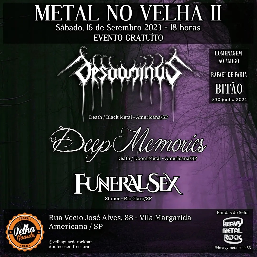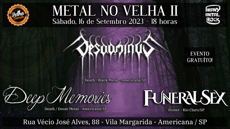 Os paulistas do DEEP MEMORIES foram confirmados em mais um importante evento neste segundo semestre de 2023. A banda estará ao lado de Desdominus e Funeral Sex no ‘Metal No Velha II’, que acontece em Americana/SP no próximo dia 16/090/2023, a partir das 18 horas. Confira abaixo o cartaz e serviço completo para mais informações: