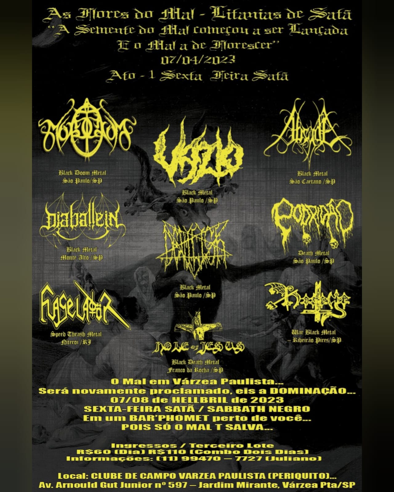 O quarteto estará no festival ‘As Flores do Mal - Litanias de Satã’ que acontece nos dias 07 e 08 de abril de 2023, e contará com nomes como Velho, Podridão, Vazio, Flagelador, Imperador Belial, Absyde e muito mais, confira:
