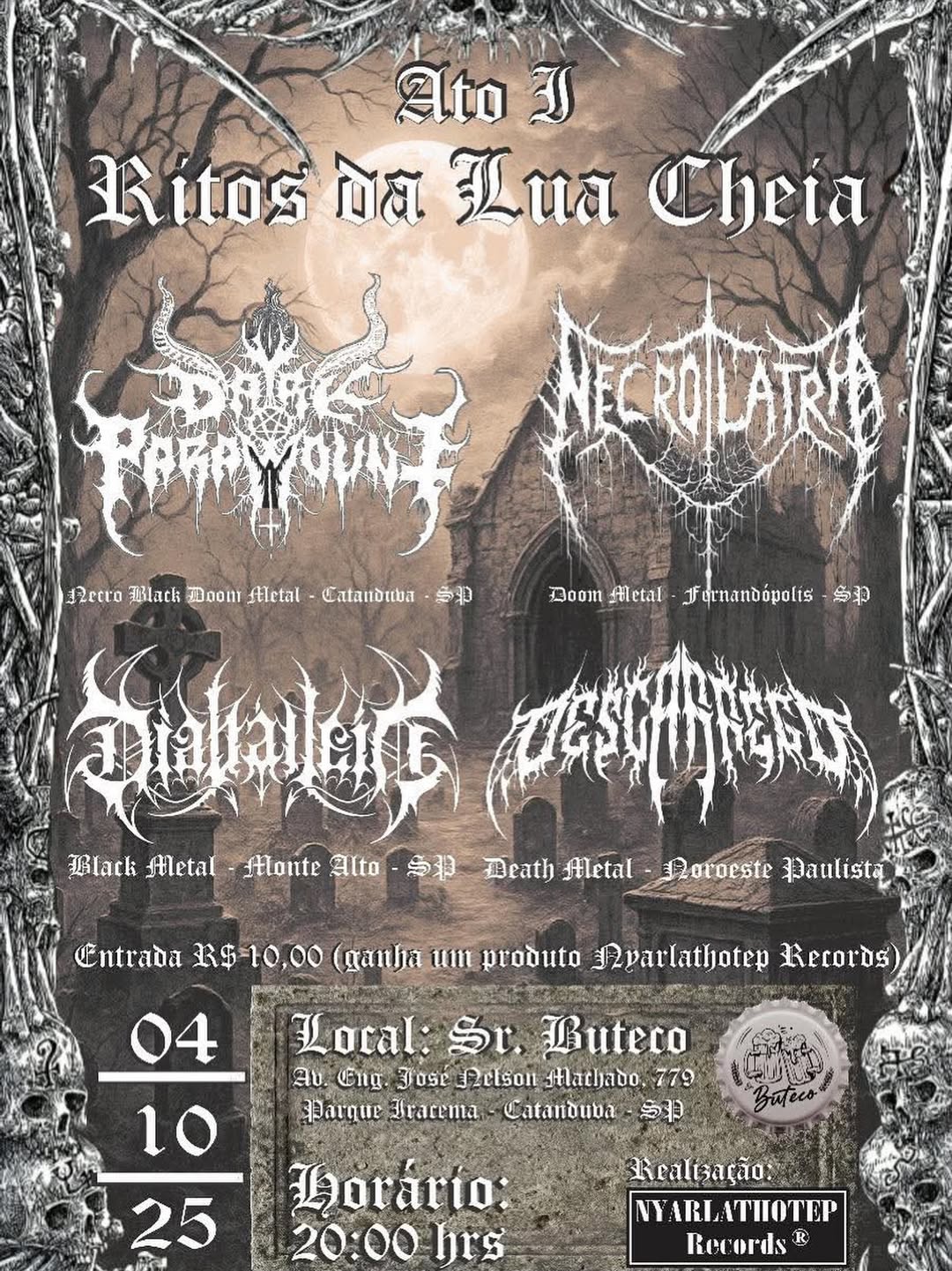 O quinteto, conhecido por suas atmosferas sombrias e intensidade ritualística, subirá ao palco do Sr. Buteco Pub (@srbutecocatanduva) no dia 04 de outubro de 2025, a partir das 20 horas. O festival contará com um line-up de peso, incluindo a participação de Dark Paramount, Necrolatria e Descarrego, prometendo uma noite inesquecível para os adeptos do Metal extremo. Confira abaixo o cartaz e o serviço completo para mais informações: