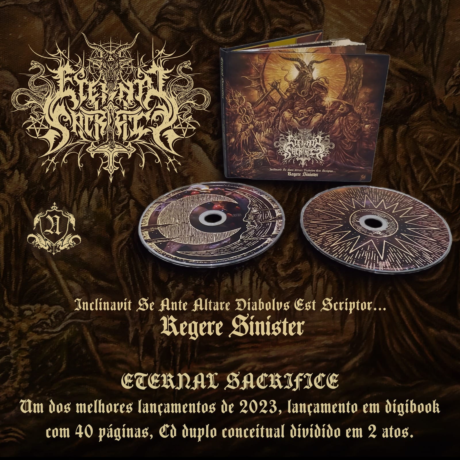“Inclinavit Se Ante Altare Diabolvs est Scriptor... Regere Sinister” é UM DISCO DUPLO E CONCEITUAL e o quinto da carreira do ETERNAL SACRIFICE, lançado (inicialmente no formato físico) em maio de 2023, o trabalho chama a atenção pela extrema qualidade, feito em DIGIBOOK COM 40 PÁGINAS e por ser um dos pioneiros do Black Metal nacional a ser distribuído neste formato.