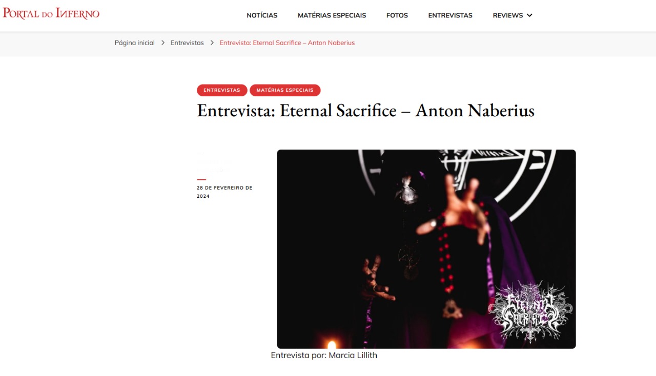 Com seu novo single, “Aihah Gibor Leohlam Satan”, lançado oficialmente o ETERNAL SACRIFICE foi destaque no site brasileiro Portal do Inferno onde concedeu uma entrevista exclusiva.