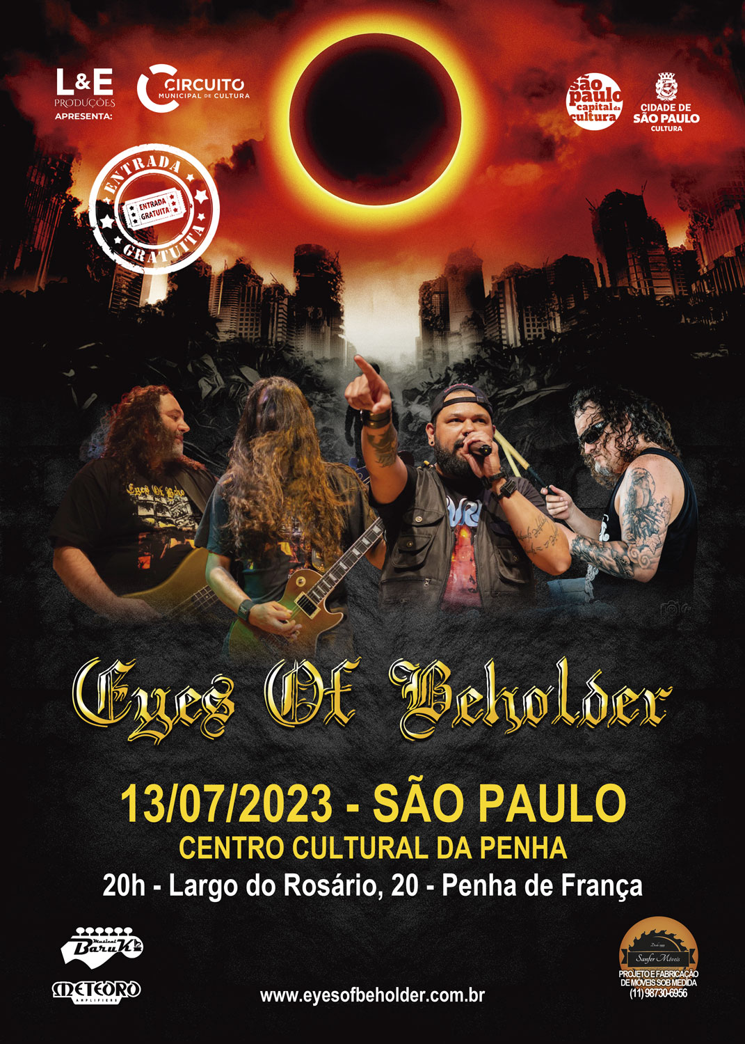 Mais um importante show para a agenda da “Visions Tour 2023” do EYES OF BEHOLDER nesta próxima quinta-feira (13/07) a partir das 20 horas. A banda estará no Centro Cultural da Penha em São Paulo/SP em evento que visa ser uma complementar à ‘Virada Cultural da cidade de São Paulo’, com o objetivo de descentralizar ações culturais em diversos polos pelo município, confira o cartaz: