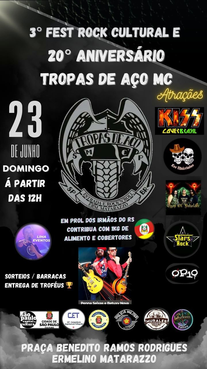 Contagem regressiva para o último show do primeiro semestre de 2024 do EYES OF BEHOLDER. A banda paulista de Heavy Metal se prepara para subir aos palcos neste domingo, 23/06, ao lado de Kiss Cover Brazil, Los Malcriados, Stars Rock, Opio e Penna Seixas, no ‘3º Fest Rock Cultural & 20º Aniversário Tropas de Aço MC’, que acontece na Praça Benedito Ramos Rodrigues em São Paulo/SP. Confira abaixo o cartaz e serviço completo para mais informações: