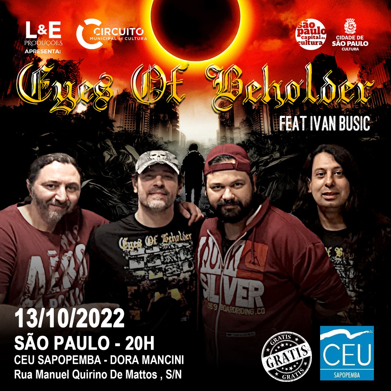 Os paulistas do EYES OF BEHOLDER seguem com tudo com os shows da atual turnê de aniversário do lançamento do álbum “Time Is Now”. A banda foi confirmada em mais um show gratuito do Circuito Municipal de São Paulo, que acontecerá no dia 13/10/2022 (quinta-feira) no CEU Sapopemba as 20 horas e contará com o baterista Ivan Busic (Dr. Sin) como convidado especial, confira:
