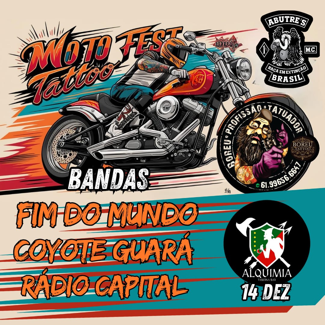 No dia seguinte, sábado, 14/12, o FIM DO MUNDO dividirá o palco do Alquimia Taberna Bar, em Brasília/DF, com Rádio Capital e Coyote Guará na segunda edição do ‘Moto Fest Tatoo’. Confira o cartaz e o serviço completo abaixo: