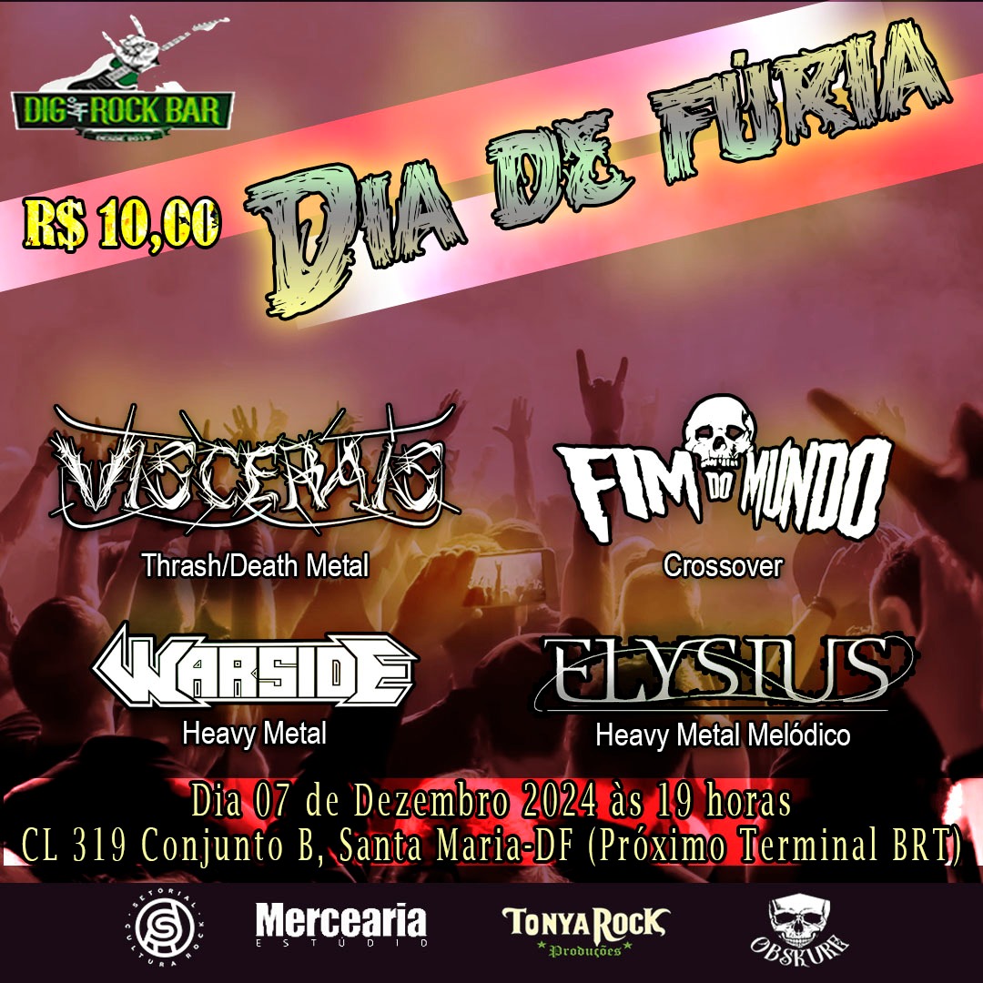 Outra grande notícia é o show que o FIM DO MUNDO fará neste sábado, dia 07/12, dividindo o palco do Dig Rock Bar, em Brasília/DF, com Viscerais, Elysius e Warside, no festival ‘Dia de Fúria’. O evento terá início às 19 horas. Confira o cartaz e as informações completas no link abaixo: