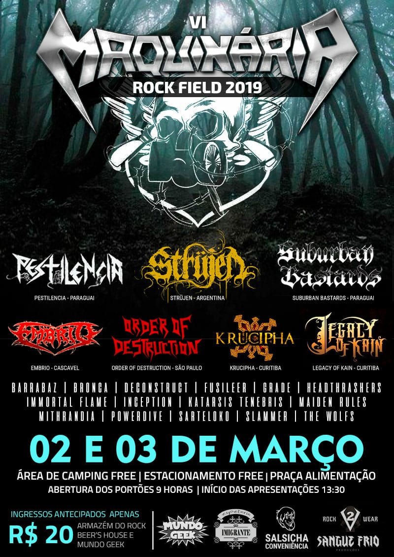 Isso mesmo, o grupo estará neste fim de semana – 02 e 03 de março – na quinta edição do ‘Maquinária Rock Field’, onde se apresentará ao lado de outras 21 bandas, dentre elas estão Pestilência (Paraguai), Strüjen (Argentina), Embrio, Slammer, Immortal Flame, Order Of Descruction, Inception e muito mais, confira o cartaz completo: