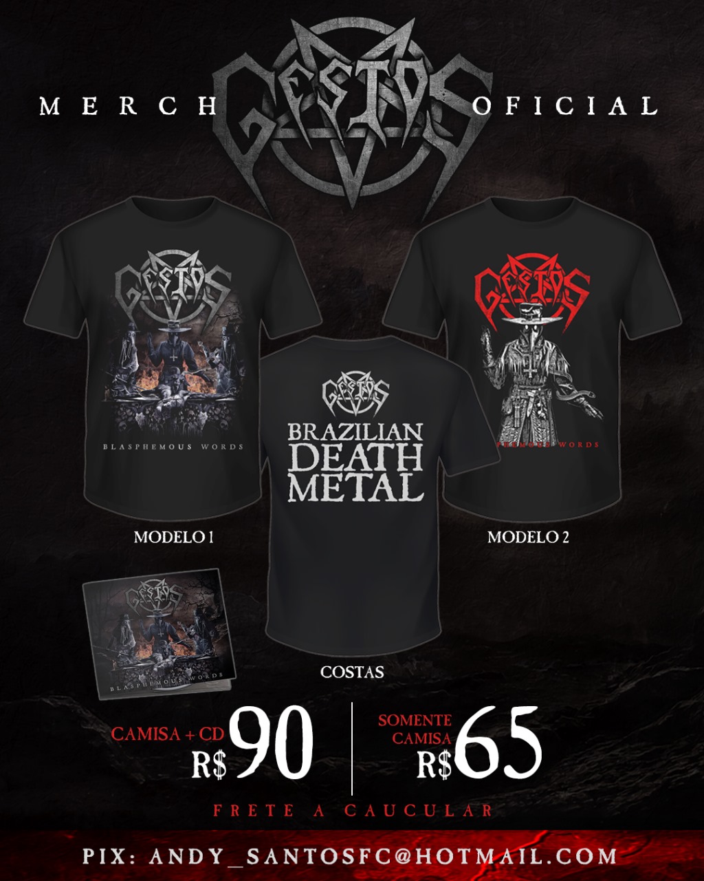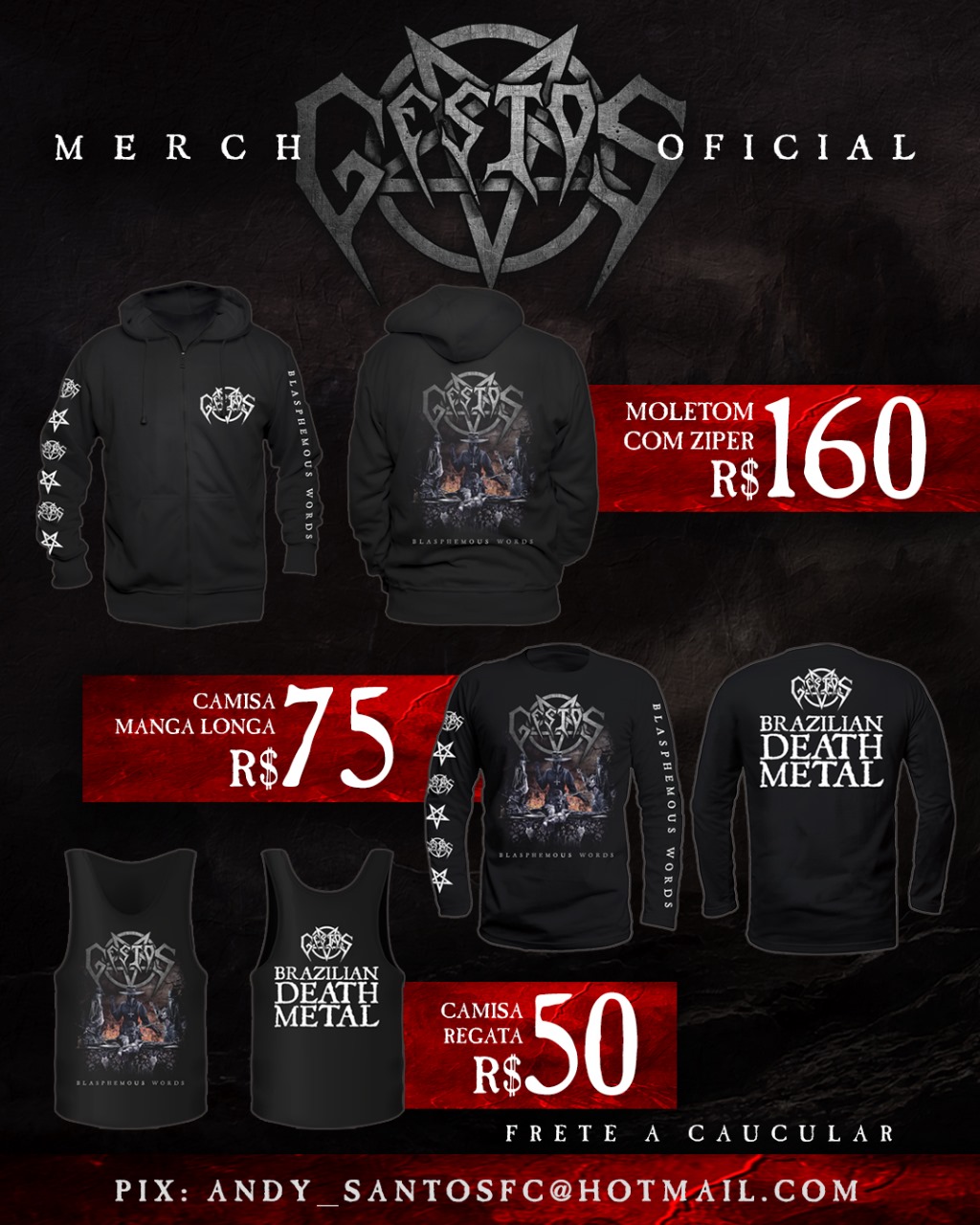 Em meio a divulgação do seu atual álbum, “Blasphemous Words”, o GESTOS anunciou em suas redes sociais que o merchandising oficial deste trabalho já está disponível para pré-venda. São regatas, camisetas (manga longa com estampa) e moletons (com zíper) que trazem estampas frente e verso nos tamanhos P, M, G, GG e XG nos seguintes valores, confira: