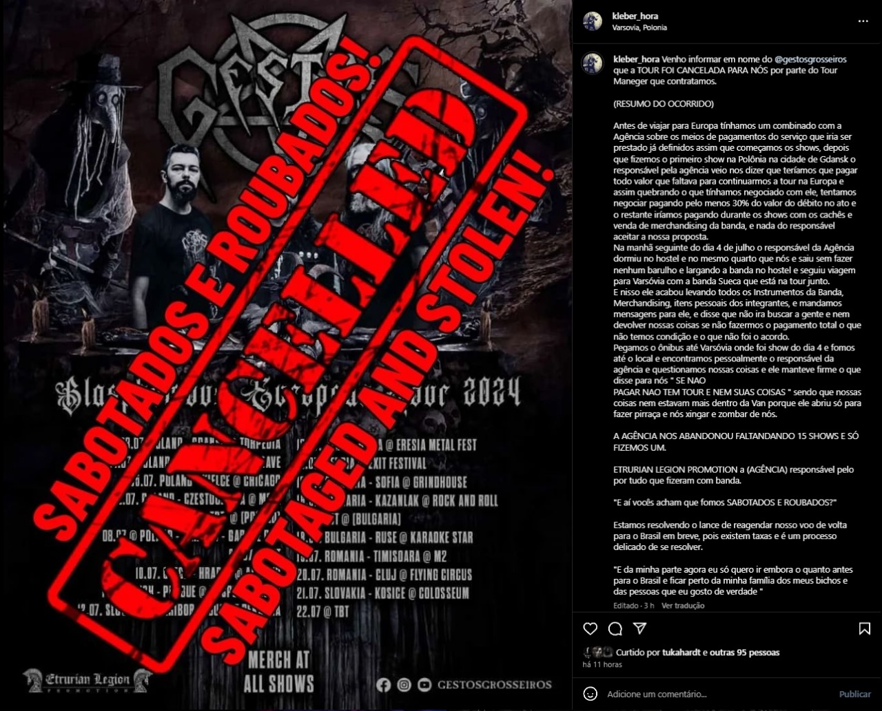 Os fãs e seguidores da banda brasileira de Death Metal GESTOS foram pegos de surpresa após uma publicação nas redes sociais do guitarrista Kleber Hora dando conta de que haviam sido roubados na Polônia.