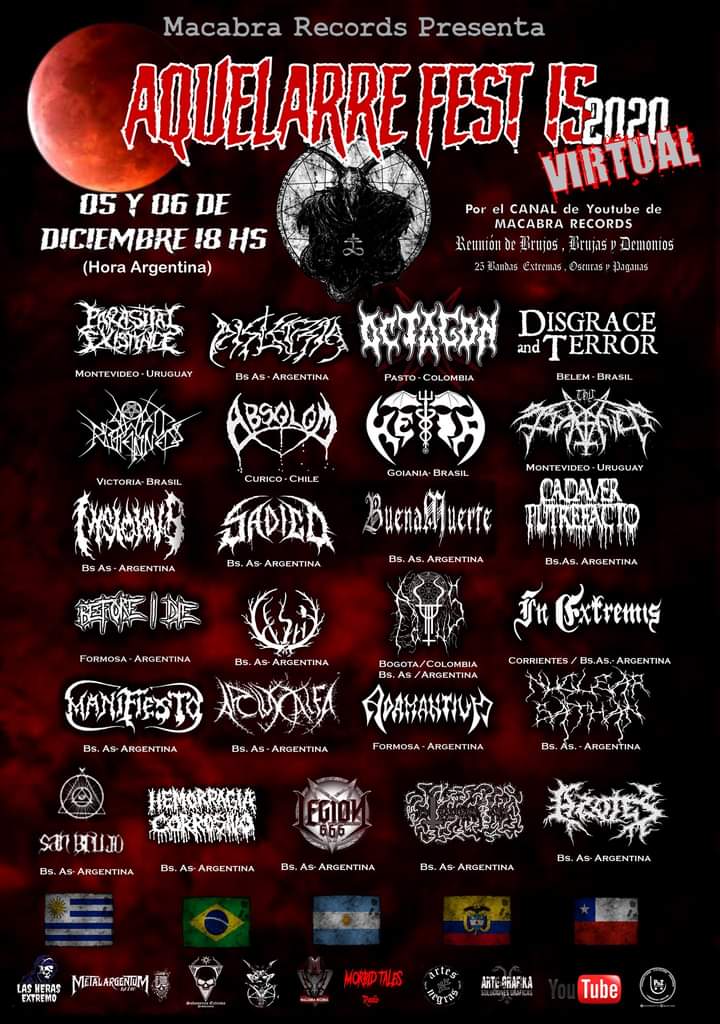 Trata-se do argentino “Aquelarre Fest 15”, que contará com nomes como Disgrace and Terror, Dilepsia, Parasital Existence, Absolom e muito mais e será transmitido gratuitamente pelo YouTube a partir das 18 horas. Confira o cartaz:
