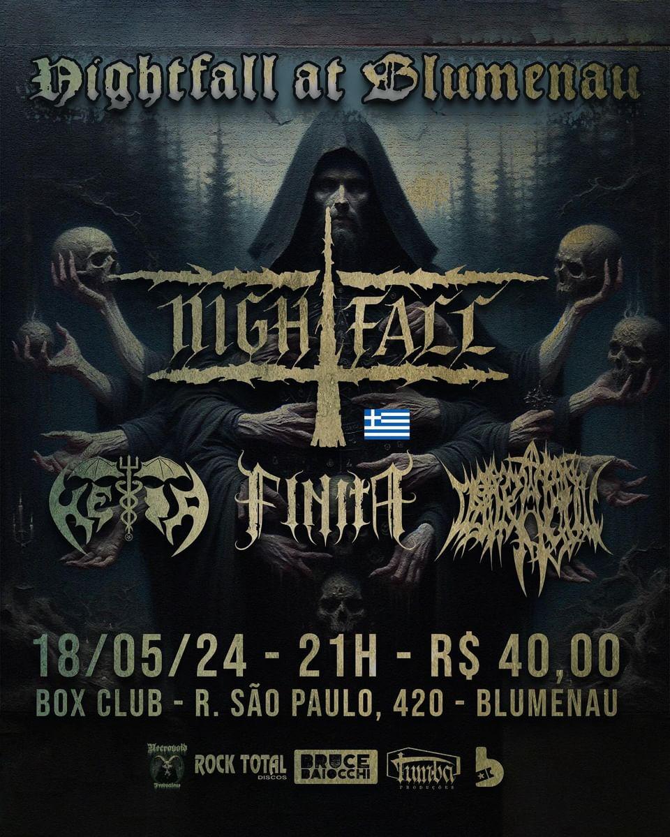 Seguindo com a série de divulgações do quadro “show por show” da turnê nacional da HÉIA, ao lado dos gregos do Nightfall, intitulada “Darkness Forever Over Brazil Tour 2024”, chegamos a Blumenau/SC. O evento ‘Nightfall at Blumenau’ está previsto para acontecer no dia 18/05/2024 (sábado) no tradicional Box Club e contará também com as bandas Finita e Desperate Soul. Confira abaixo o cartaz e serviço completo para mais informações: