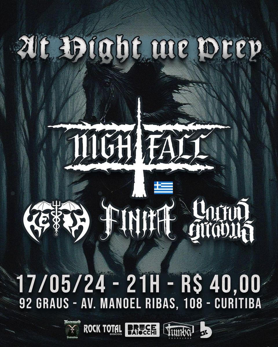 Seguindo com os trabalhos de divulgação da rota de shows da “Darkness Forever Over Brazil Tour 2024”, onde os goianos da HÉIA se apresentarão pelo Brasil ao lado dos gregos do Nightfall, chfou a hora de saber mais sobre o ‘At Night We Prey’. Este evento acontecerá no dia 17/05 em Curitiba/PR — no lendário 92Graus — e além das duas bandas citadas, estarão presentes também Noctus Rcanus e Finita. Confira abaixo o cartaz e serviço completo para mais informações: