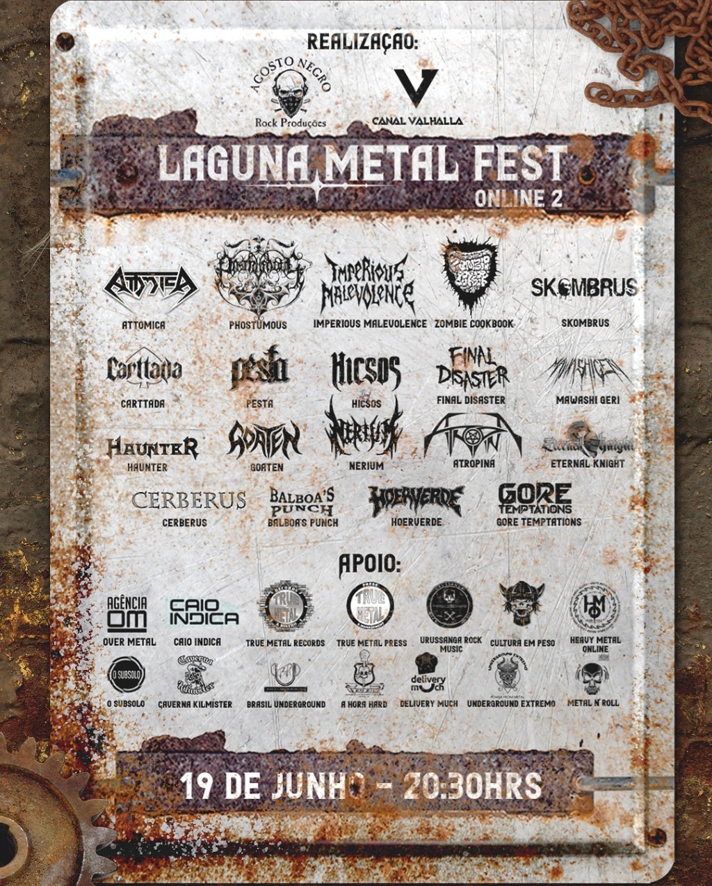 Trata-se do ‘Laguna Metal Fest – Online 2’, que será transmitido pelo canal oficial do Metal Valhalla no YouTube a partir das 20h e 30 min e contará com outras 18 atrações, dentre elas estão Attomica, Zombie Cookbook, Phostumous, Pesta, Skombrus e muito mais, confira o cartaz:
