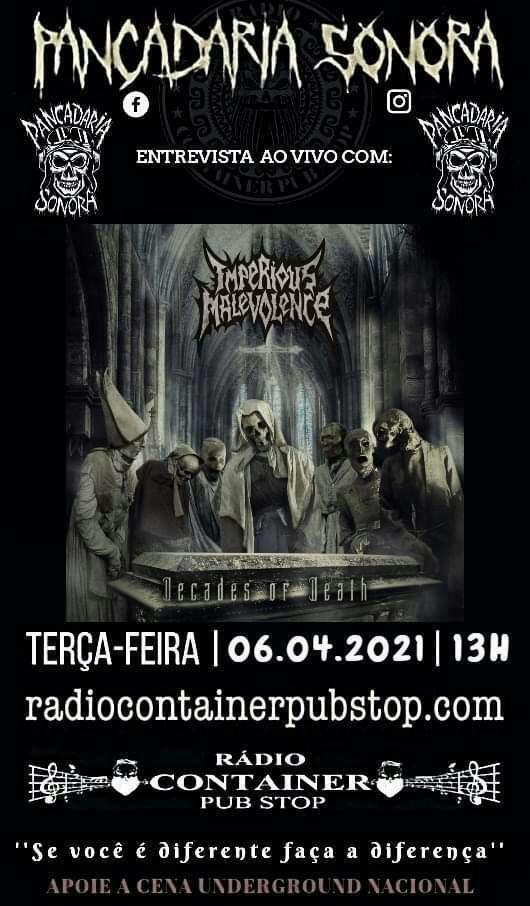 No dia 06/04/2021 (terça-feira), a partir das 13 horas, a banda de Death Metal IMPERIOUS MALEVOLENCE estará participando ao vivo do programa Pancadaria Sonora, apresentado por Thiago Queiroz.