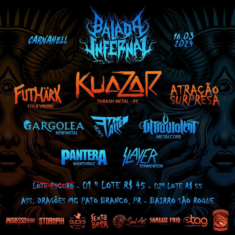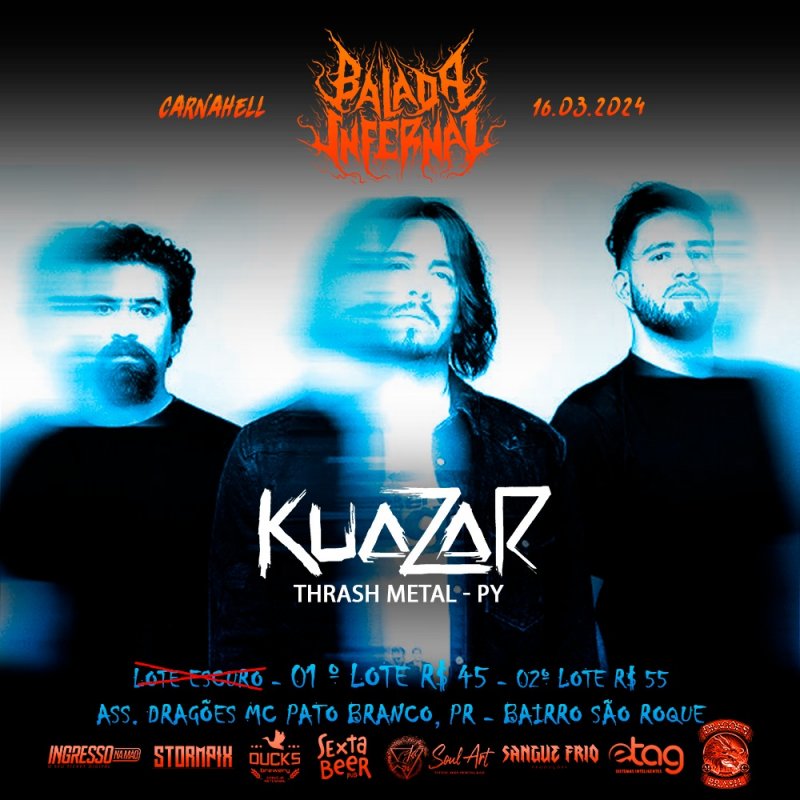 Um dos principais nomes do Metal sul-americano, o KUAZAR, já tem data marcada para retornar ao Brasil após uma longa espera de 9 anos. Em nova fase, os paraguaios celebram a boa receptividade do seu atual álbum “Hybrid Power” e acabam de ser confirmados como headliners da mais nova edição do ‘BALADA INFERNAL 2024 - Carnahell’, que acontece no dia 16/03 em Pato Branco/PR e contará também com Futhärk, Ultra Violent, The Fallen, Gargolea, Manthraz, Tormentor e mais uma atração surpresa que será anunciada em breve. Confira abaixo o cartaz e serviço completo para mais informações: