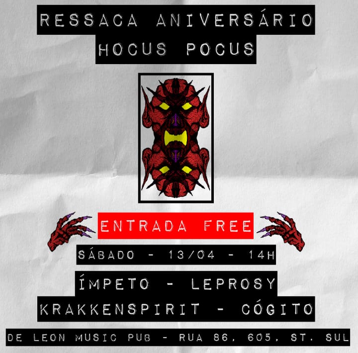 Após o sucesso do evento de aniversário de 32 anos da lendária Hocus Pocus, que contou com a presença do LEPROSY, foi anunciada edição “Ressaca” para este fim de semana. O show acontece neste sábado (13/04) em Goiânia/GO e contará também com Ímpeto, Krakkenspirit e Cógito e o melhor: ENTRADA FREE! Confira abaixo o cartaz e serviço completo para mais informações: