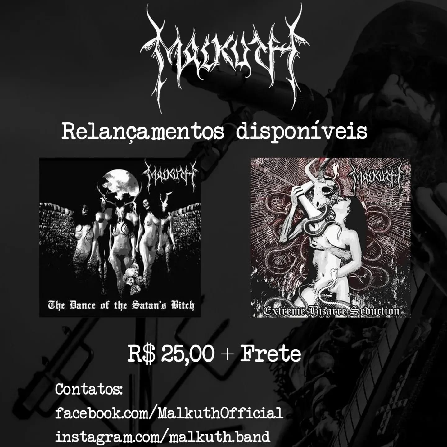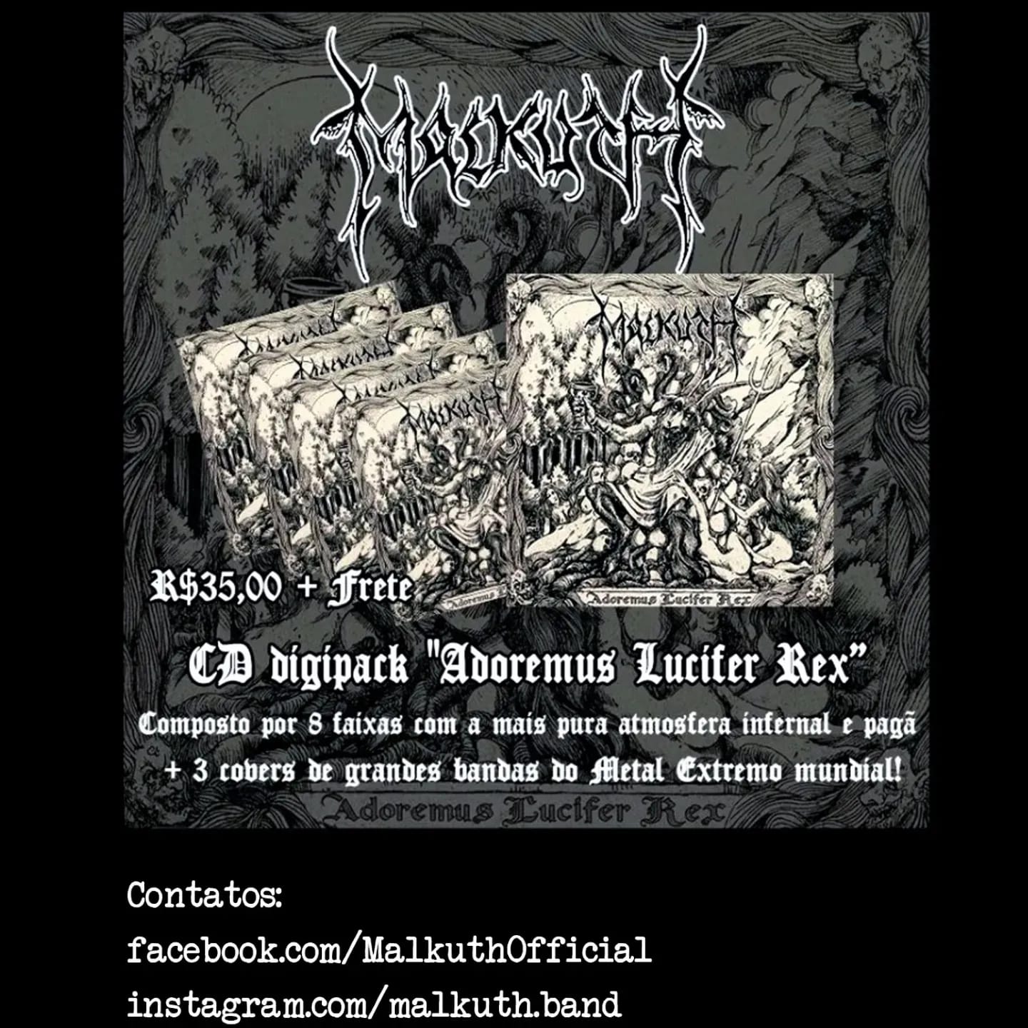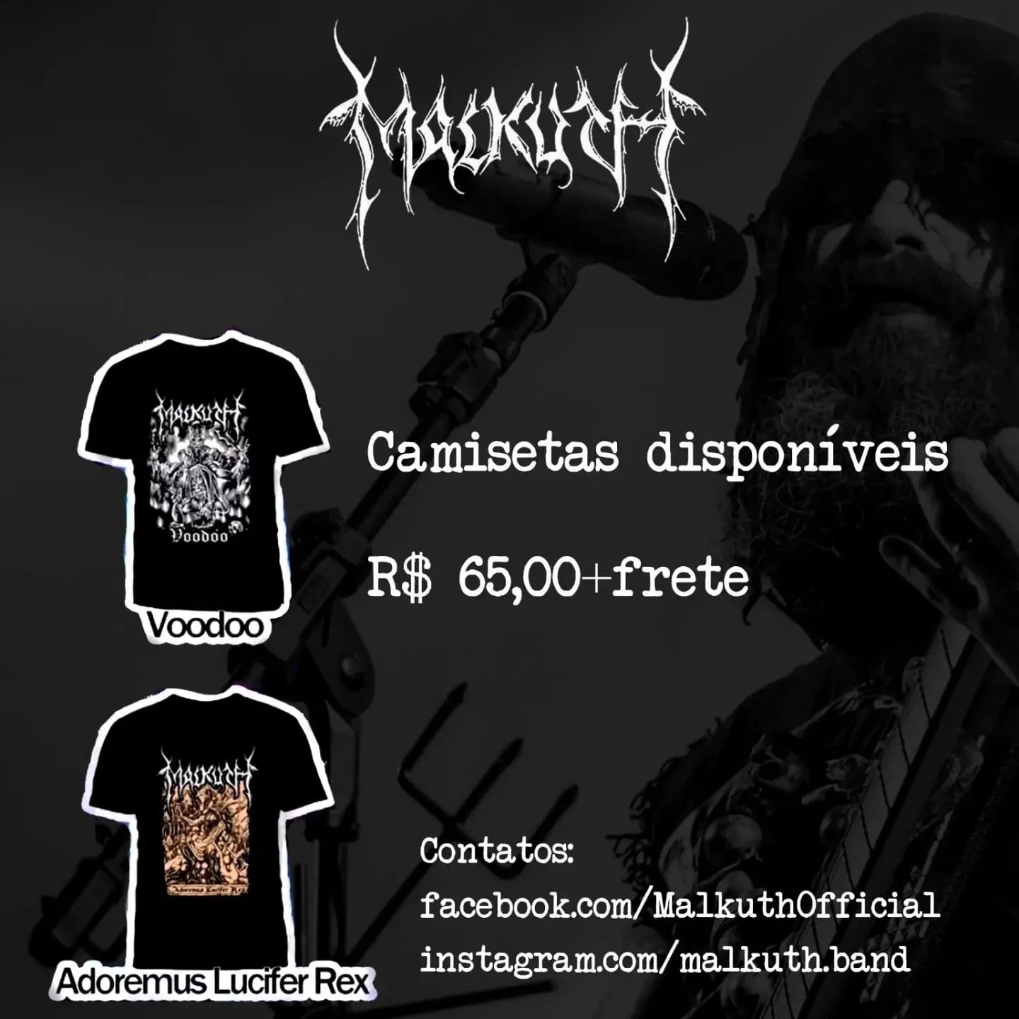 Em outras notícias, o MALKUTH segue com seu merchandising oficial disponível em estoque para comercialização, são camisetas do álbum “Voodoo” e “Adoremus Lucifer Rex” no tamanho G, por apenas R$ 65,00 (+frete) cada, o digipack de “Adoremus Lucifer Rex” por R$ 35,00 (+frete) e os relançamentos remasterizados dos clássicos “The Dance of the Satan's Bitch” e “Extreme Bizarre Seduction” por R$ 25,00 (+frete). Confira: