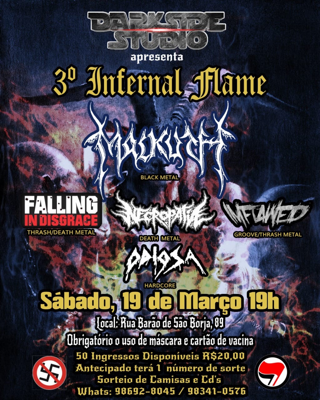 A banda se apresentará no ‘3º Infernal Flame’, que acontece no próximo dia 19/03/2022, a partir das 19 horas, no Darkside Studio e contará também com Falling In Disgrace, Necropatia, Imflawed e Odiosa, confira o cartaz: