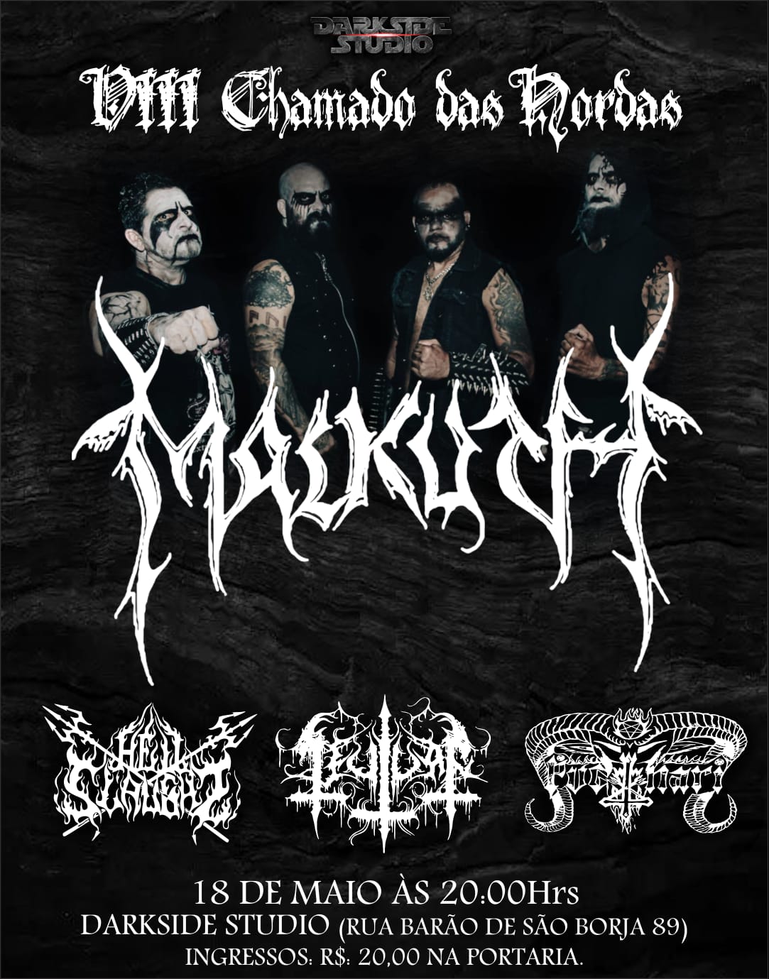 O quarteto será o headliner da oitava edição do tradicional festival pernambucano de Metal Extremo ‘Chamado das Hordas’, que acontece neste sábado (18/05) no Darkside Studio em Recife e contará também com Evrah, Pugnari e Hellslaught. Confira abaixo o cartaz e o serviço completo para mais informações: