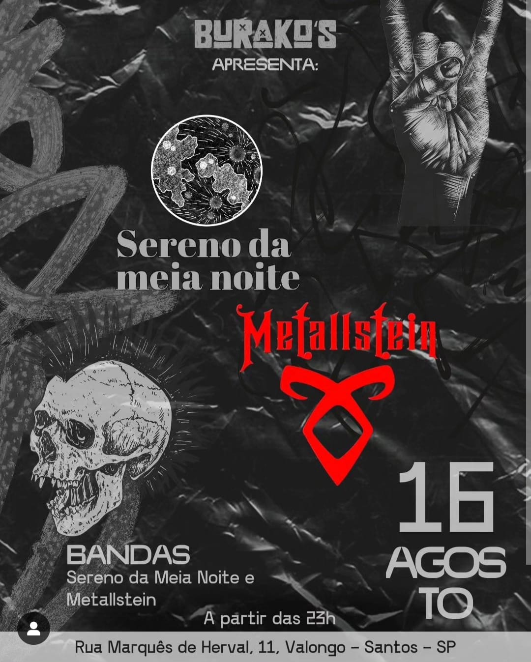 É HOJE (16/08)! A banda de Death/Thrash Metal METALLSTEIN prestigia sua cidade natal, Santos/SP com um show exclusivo e gratuito. O quarteto se apresentará, ao lado de Sereno da Meia Noite no Burako's a partir das 23 horas. Confira abaixo o cartaz e o serviço completo para mais informações:
