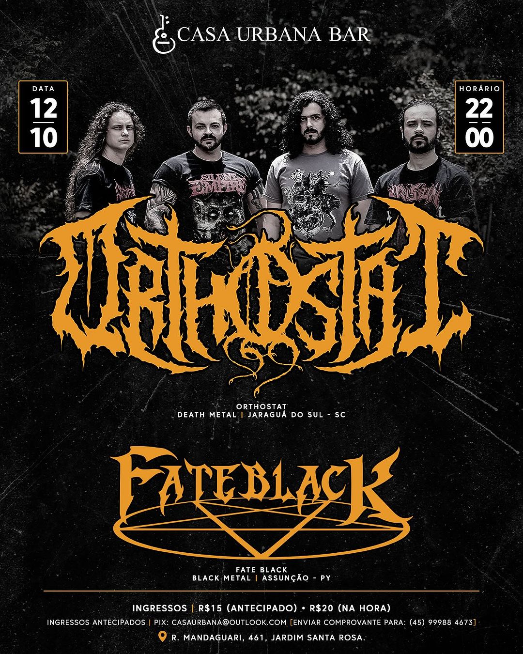 No dia seguinte, 12/10, o ORTHOSTAT desembarca pela primeira vez em Foz do Iguaçu/PR, onde se apresentarão, ao lado dos paraguaios do Fate Black, na Casa Urbana Bar. Confira abaixo o cartaz e o serviço completo para mais informações:
