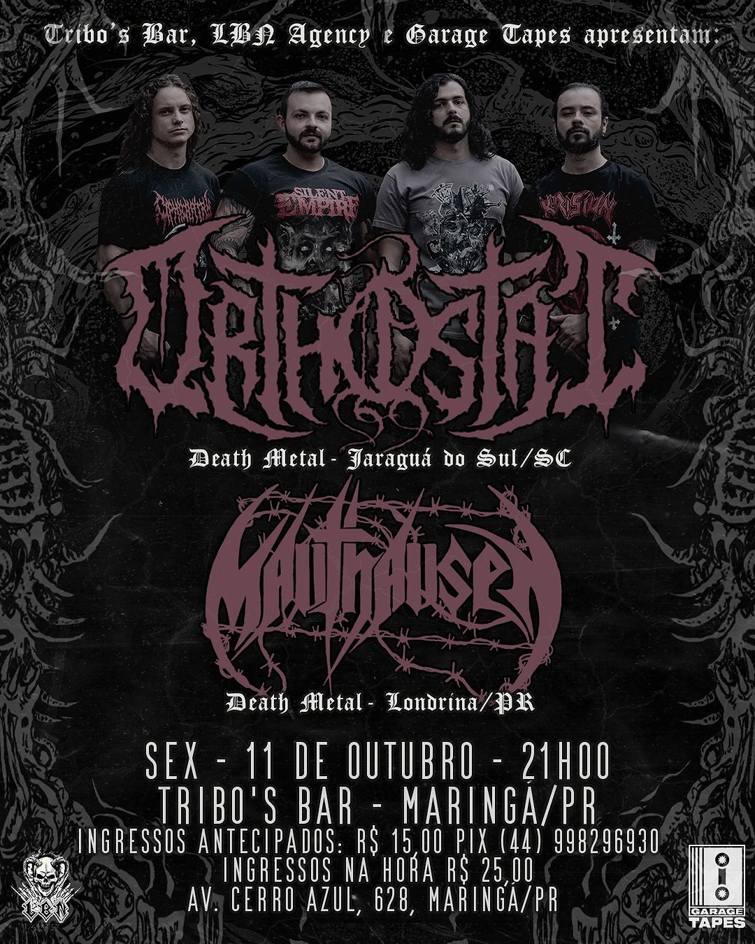 O primeiro deles acontecerá na sexta-feira (11/10), no lendário Tribos’s Bar, em Maringá/PR, onde a banda dividirá palco com os londrinenses do Mauthausen. Confira abaixo o cartaz e as informações completas sobre o evento: