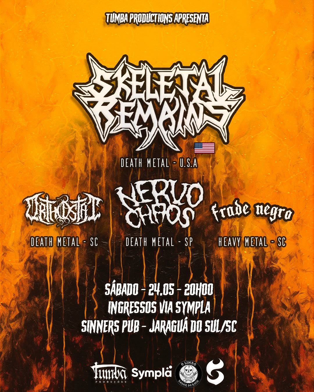 Em meio a uma agenda intensa de preparativos e anúncios, o ORTHOSTAT se prepara para mais um momento decisivo em sua trajetória. No próximo sábado, 24 de maio, a banda se junta aos norte-americanos do Skeletal Remains, além dos brasileiros NervoChaos e Frade Negro, em um evento que promete estremecer Jaraguá do Sul/SC. O show acontece no Sinners Pub, a partir das 20h, e os ingressos estão disponíveis online. Confira abaixo o cartaz e o serviço completo para mais informações: