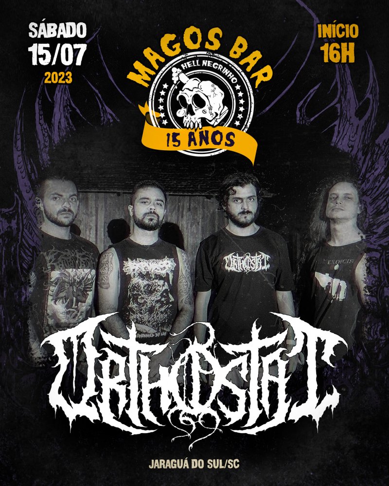 Contagem regressiva para a grande festa de 15 anos do Magos Bar em Rio Negrinho/SC, que conta com o ORTHOSTAT entre as atrações confirmadas. Isso mesmo, o evento acontecerá neste sábado (15/07) e terá também nomes como Podridão e Beyond The Grave, de São Paulo, a goiana Zeugma e as catarinenses Precipício, Bomba no Porão e Violent Curse, confira abaixo o cartaz e serviço completo para mais informações: