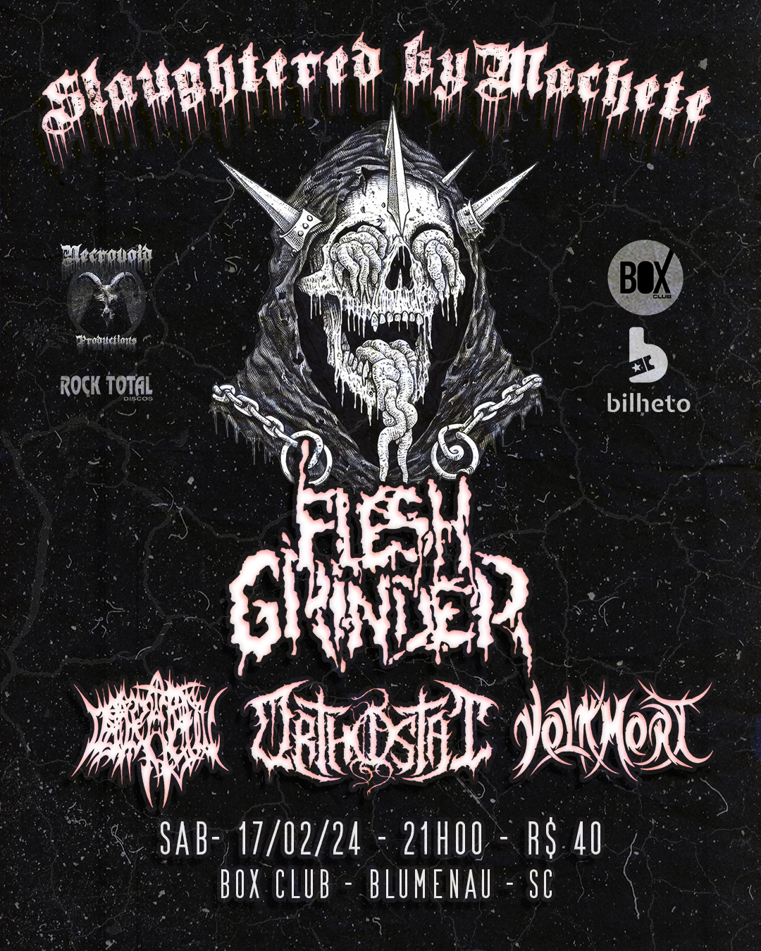 O primeiro deles, ‘Slaughtered By Machete’, acontecerá no sábado (17/02), onde a banda se apresenta no Box Club em Blumenau/SC, evento que contará também com Volkmort (divulgando seu álbum “Fallen In The Bloody Field”) e Desperate Soul. Confira abaixo o cartaz e serviço completo para mais informações: