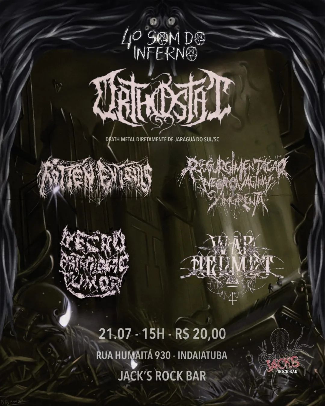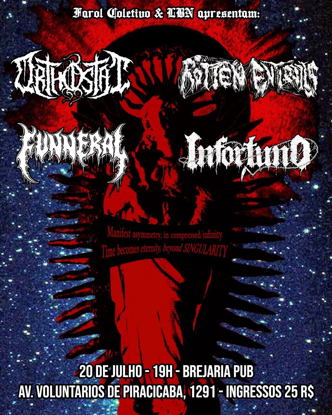 No dia seguinte (20/07), o ORTHOSTAT e o Rotten Entrails pegam a estrada rumo a Piracicaba/SP, onde — no Brejaria Pub — dividem palco com Funneral e Infortuno, em evento que se iniciará as 19 horas. Cartaz e serviço abaixo: