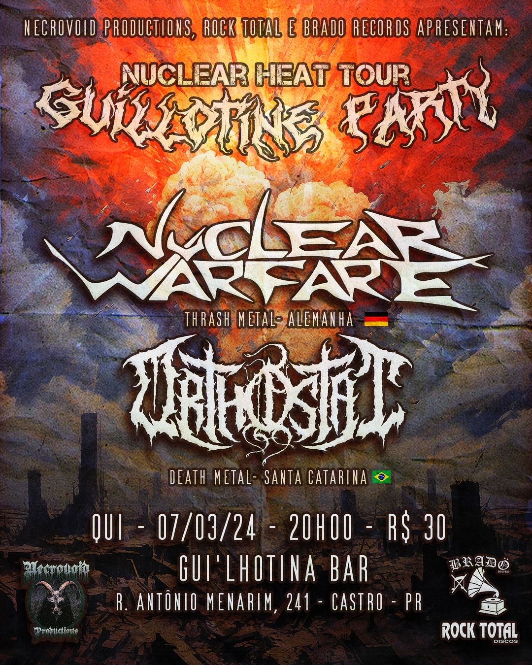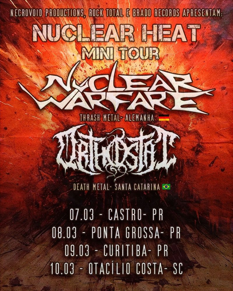 O ORTHOSTAT já está nos preparativos finais para pegar a estrada novamente onde farão quatro grandes shows ao lado dos alemães do Nuclear Warfare. O quarteto pega a estrada já no dia 07/03 (quinta-feira) até a cidade de Castro/PR, onde acontece o ‘Guilhotine Party’, evento que se iniciará as 20 horas no Guilhotina Bar. Confira:
