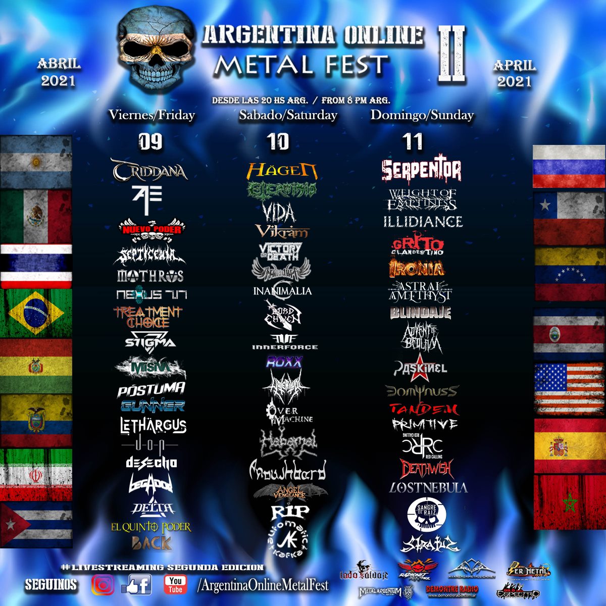 Trata-se do ‘Argentina Online Metal Fest II’, que contará com nomes como Serpentor, Hägen, Exterminio, Misiva, Vikram, Mathras, Illideance (Rússia), Weight Of Emptiness (Chile), Nexus 7.17 (Marrocos), Anoushbard (Iran) e muito mais, confira o cartaz completo: