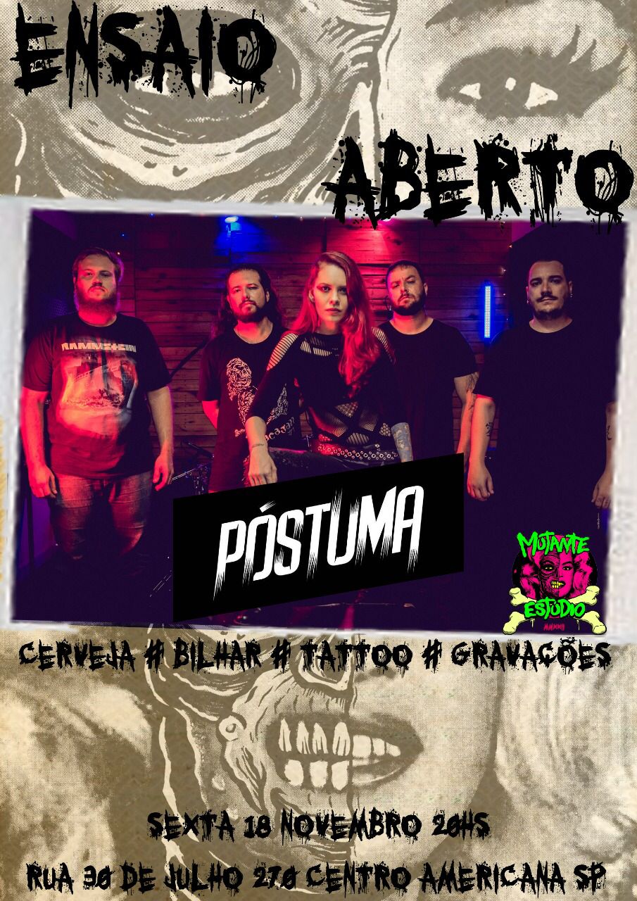 Os paulistas do PÓSTUMA divulgaram em suas redes sociais que estarão participando de um ‘ensaio aberto’ nesta sexta-feira (18/11) em Americana/SP. O evento vem sendo promovido pela Mutante Estúdio e se iniciará a partir das 20 horas, confira o cartaz com endereço e demais informações: