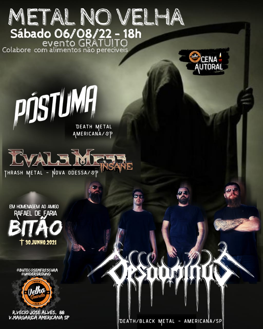 No dia seguinte, 06/08 (sábado), o quinteto retorna à sua cidade natal – Americana/SP – onde, ao lado de Evals Mess e Desdominus, subirão aos palcos do Velha Guarda Rock Bar em evento gratuito, com arrecadação de alimentos não perecíveis, veja: