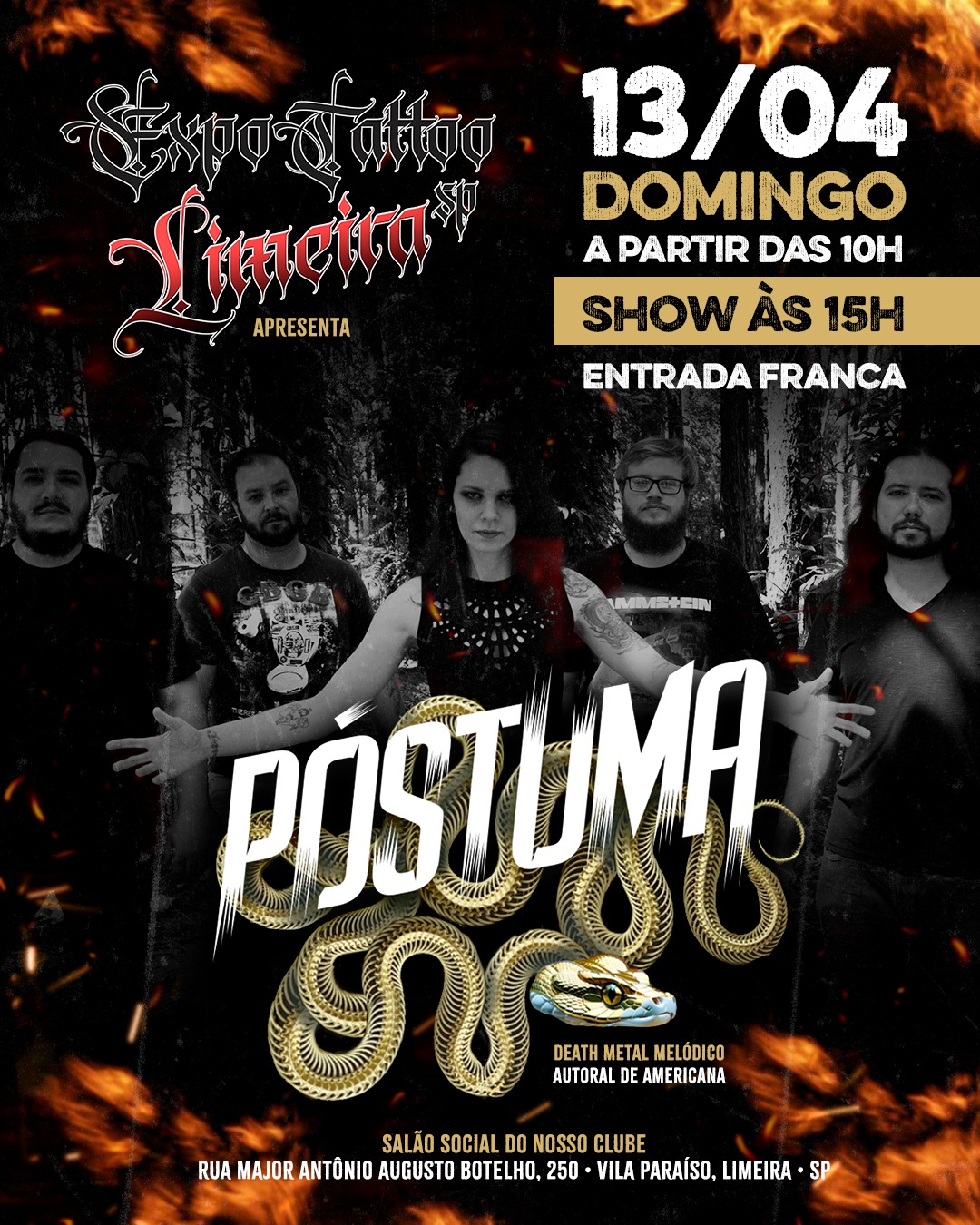 Mas as novidades não param por aí! Para celebrar o lançamento, a banda fará um show especial no domingo, 13 de abril, durante o ‘Expo Tattoo Limeira’. O evento acontece no Salão Social do Nosso Clube, em Limeira/SP, e tem entrada franca (ou a doação de 1 kg de alimento não perecível para ações sociais locais). O show da PÓSTUMA está marcado para as 15h, mas os portões se abrem às 10h, com atrações diversas ao longo do dia, como food trucks, área kids, concurso ‘Miss Tattoo’ e mais. Confira abaixo o cartaz de confirmação e serviço completo para todas as informações: